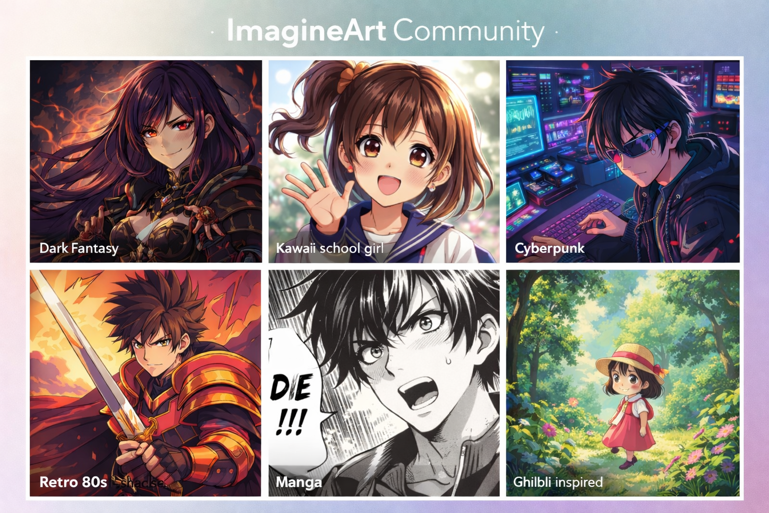 - Character generation across every anime style, chibi, dark fantasy, cyberpunk, semi-realistic, manga, Ghibli-inspired, retro