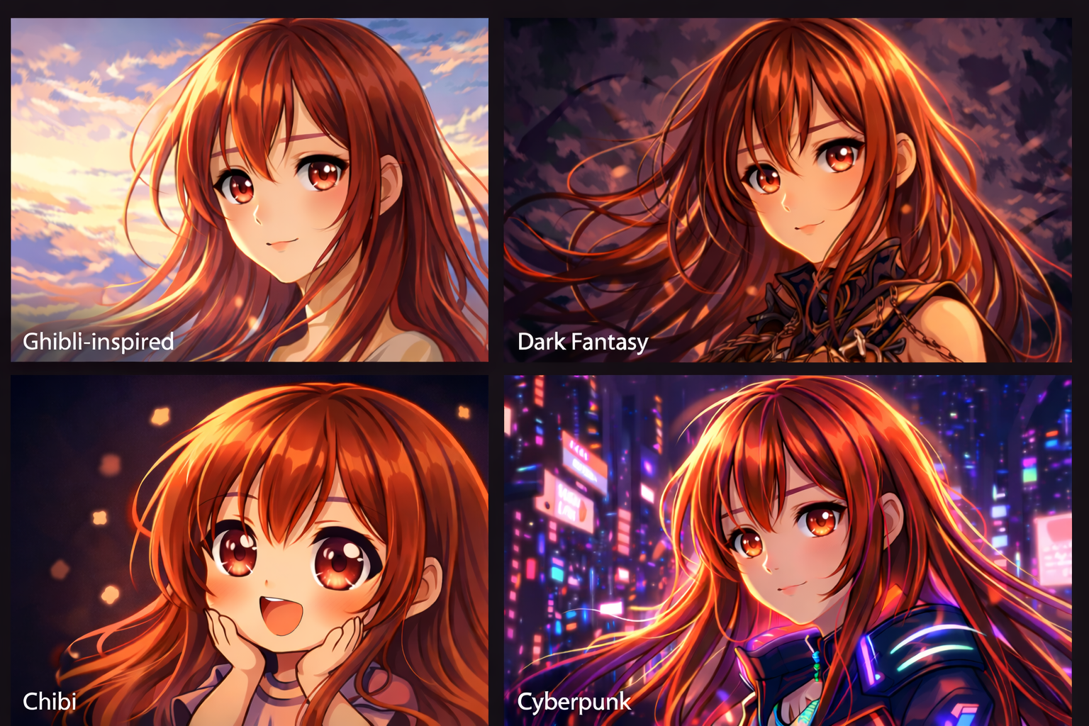 - Style variation sets exploring the same character across multiple anime aesthetics, how does this character look in Ghibli-inspired styling versus cyberpunk, versus dark fantasy