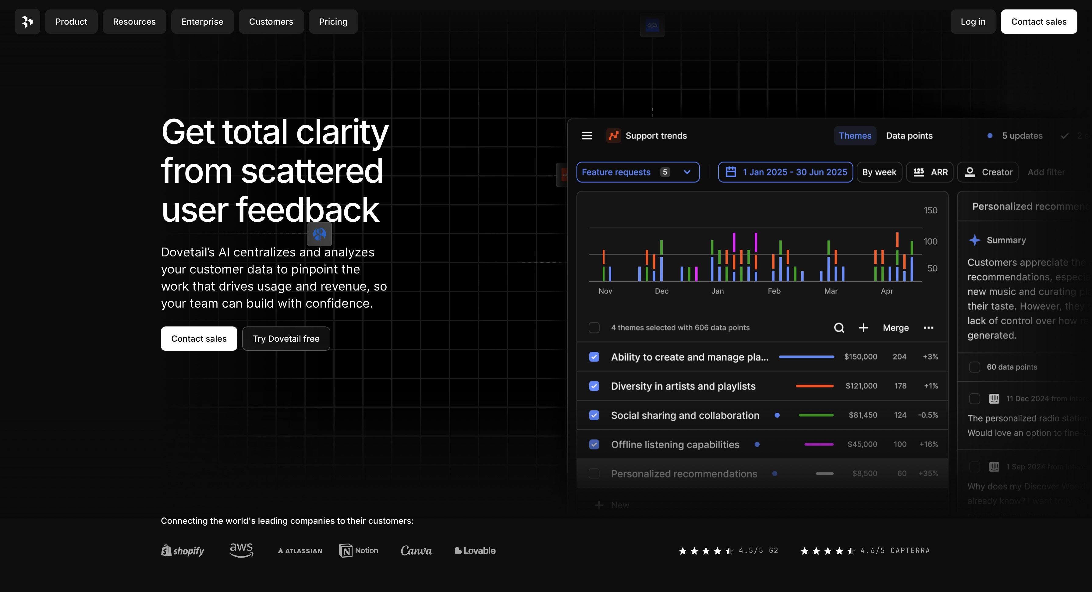 Dovetail is a research analysis platform that uses AI to turn user interviews, survey responses, and usability notes into structured insights. It transcribes interviews, identifies themes, and surfaces patterns across large volumes of qualitative data, cutting the analysis time that traditionally makes research a bottleneck in fast-moving product teams.