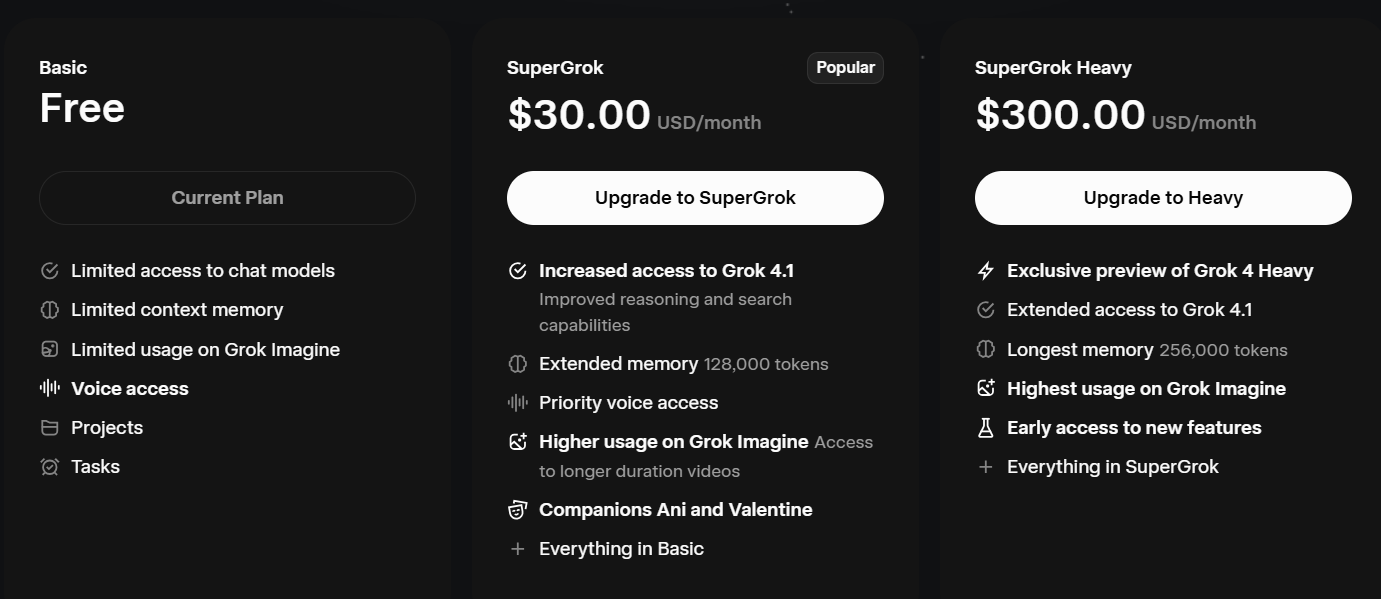 - Premium (Super Grok): Super Grok unlocks higher usage limits, faster generations, priority access, and more consistent image and video outputs for regular creators and marketers.