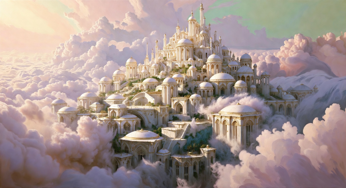 “Surreal illustration of a floating city above clouds, pastel colors, dreamy atmosphere, detailed fantasy art.”