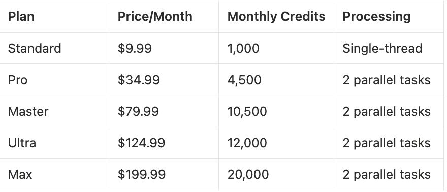 - For professional studios: The Master, Ultra, and Max plans provide substantial credits and unlimited access to specific models, perfect for high-volume production.