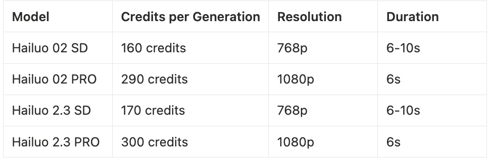 - Credit consumption across all four Hailuo models