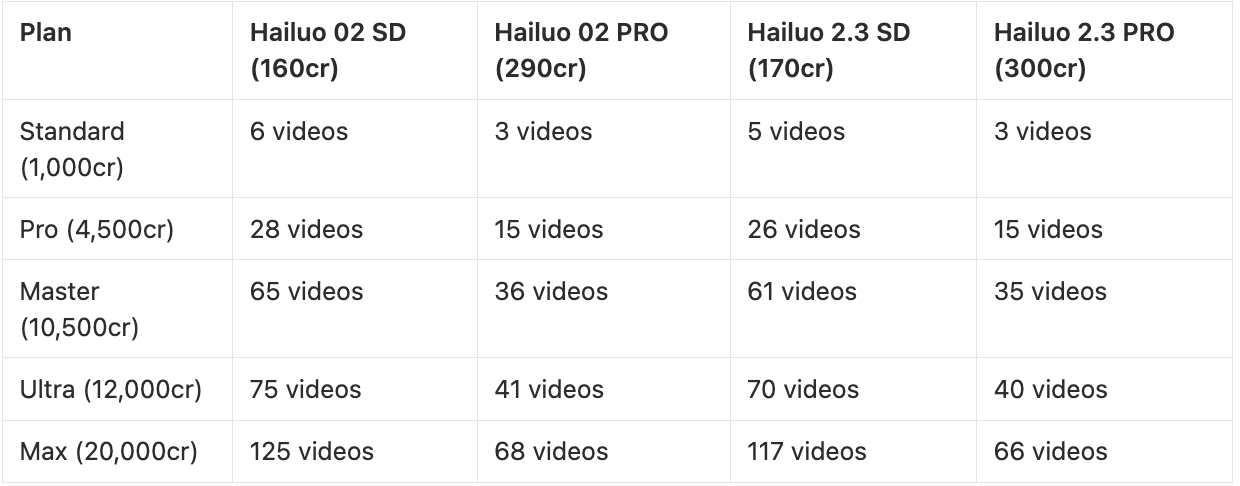 Here's how your monthly credits translate to actual video output across different models.