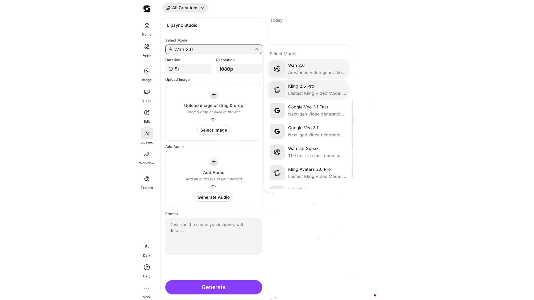 | Lipsync / Voiceover | Lipsync Studio | Lipsync Studio with voice cloning, Speak feature |