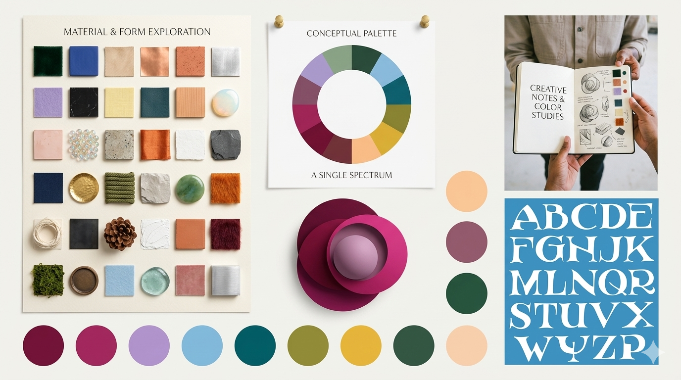 6. Material-contrast moodboards — Pair opposing textures intentionally. Rough concrete against soft silk. Cold steel against warm wood. The tension between materials creates visual energy that drives bold creative directions.