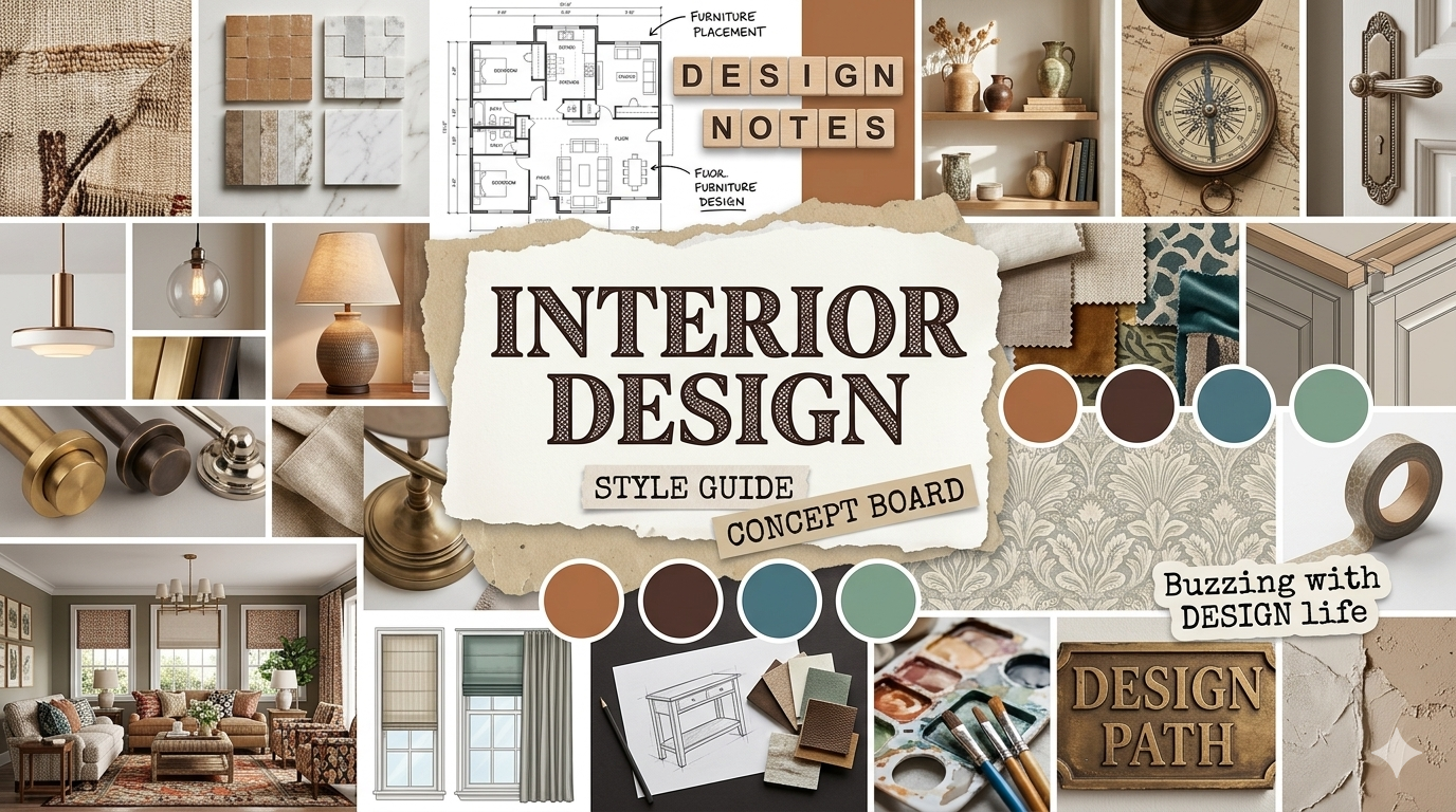 An interior design moodboard maps out a space before anything is purchased. It brings together furniture references, wall colors, flooring textures, lighting styles, and decorative details.