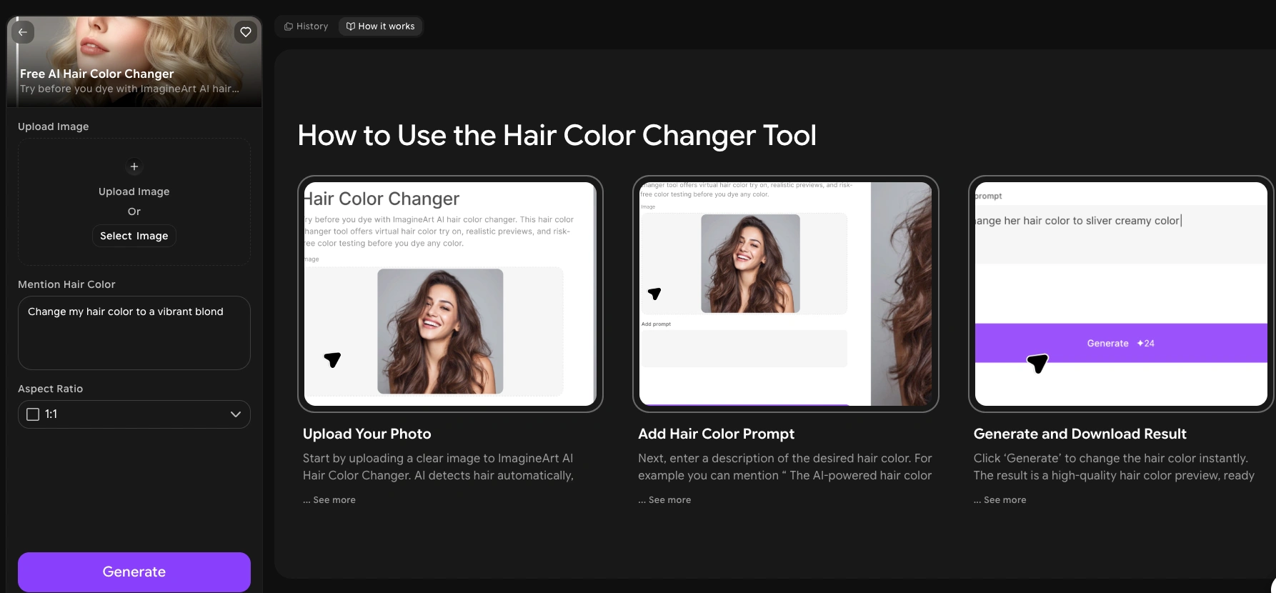This is exactly what ImagineArt is built for. Upload any existing photo of yourself, type in the color you want to test, and hit generate. You can run the same photo multiple times with different color prompts to compare looks. There is no limit to how many options you can preview.