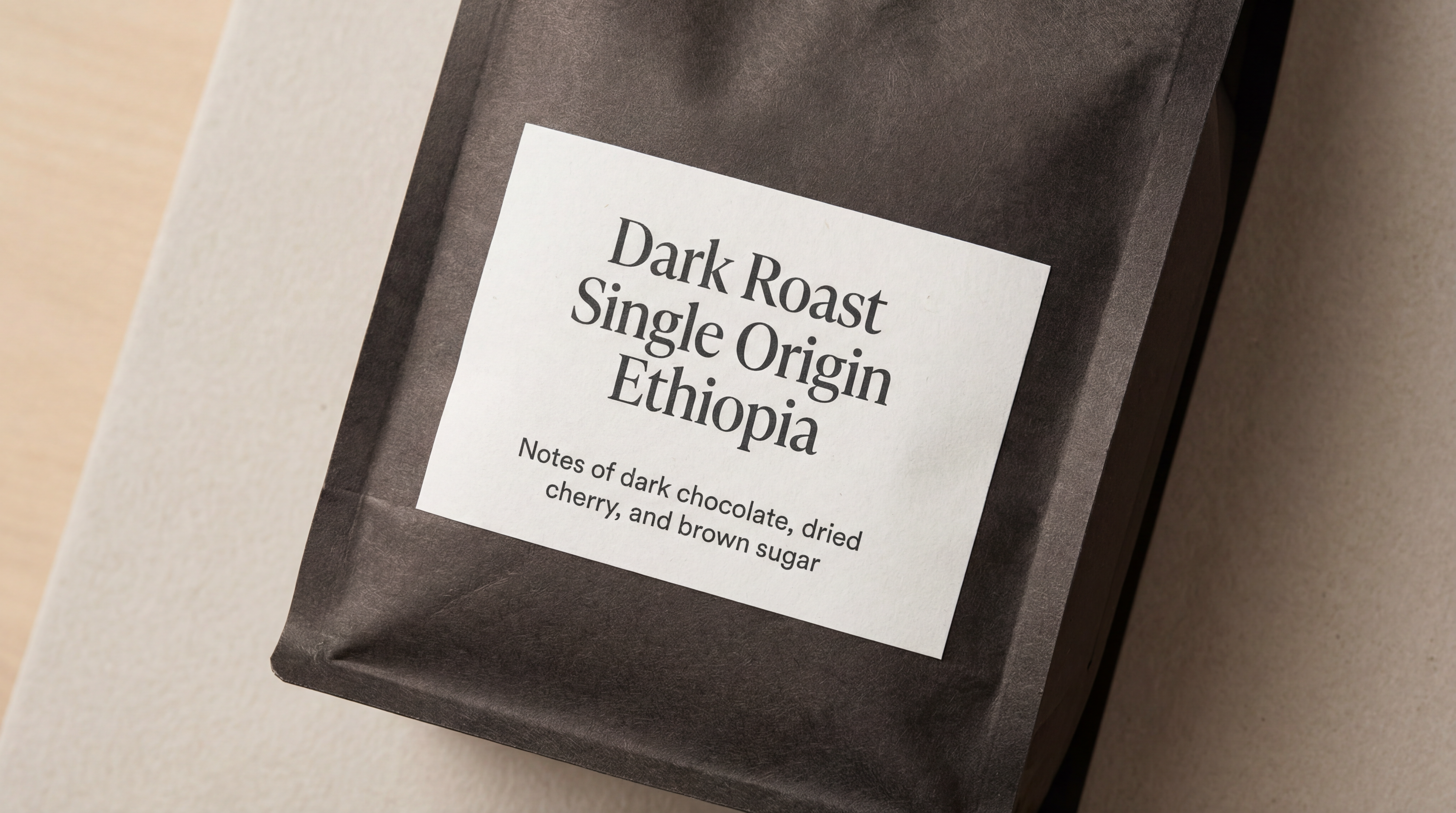 - "A product label for an artisan coffee bag reading 'Dark Roast Single Origin Ethiopia' in a clean serif font at the top, with tasting notes listed below in two lines: 'Notes of dark chocolate, dried cherry, and brown sugar' in smaller body copy"