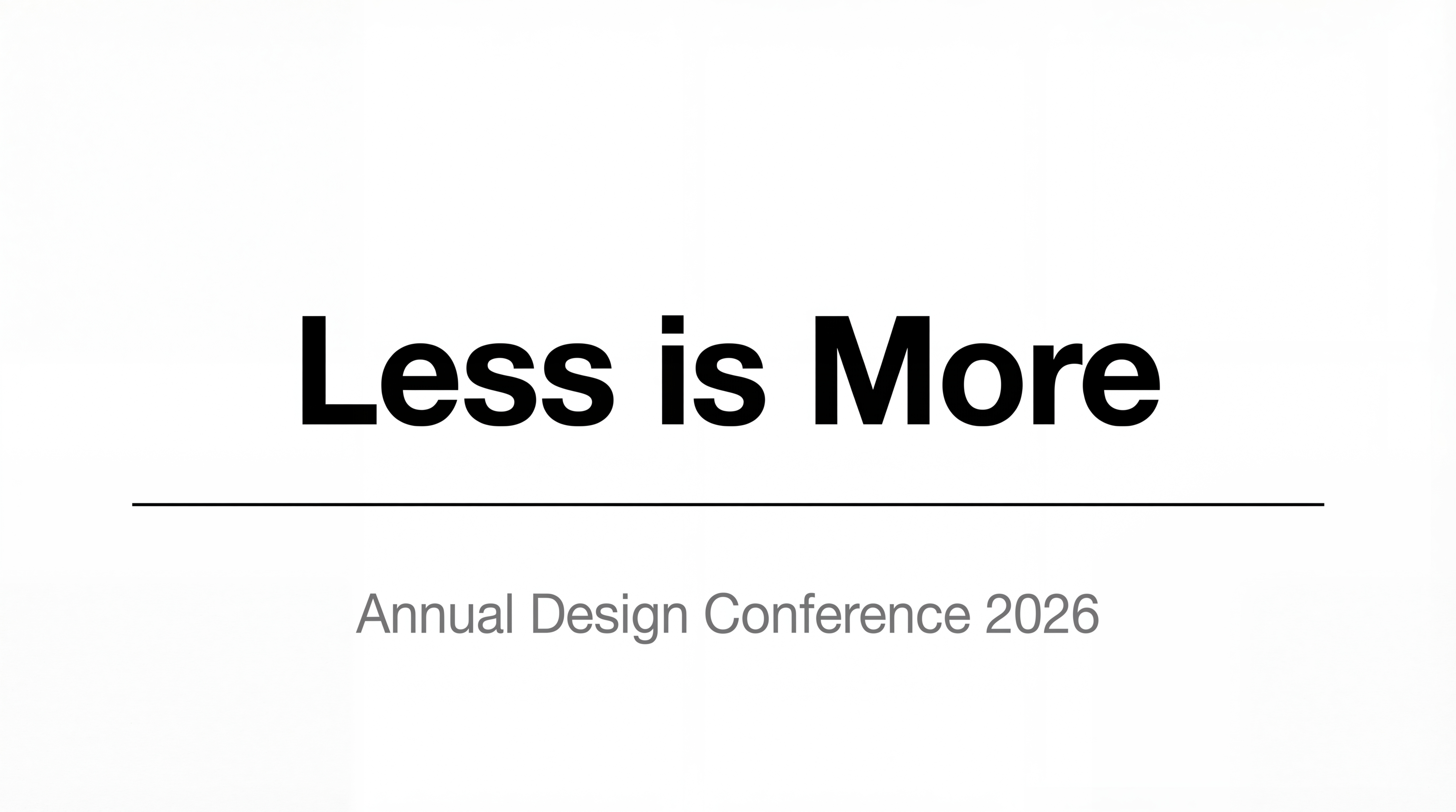 - "A minimalist poster with the headline 'Less is More' in large black sans-serif type on a white background, with a single thin horizontal rule below the headline and a small subtitle reading 'Annual Design Conference 2026' in 12pt grey font."