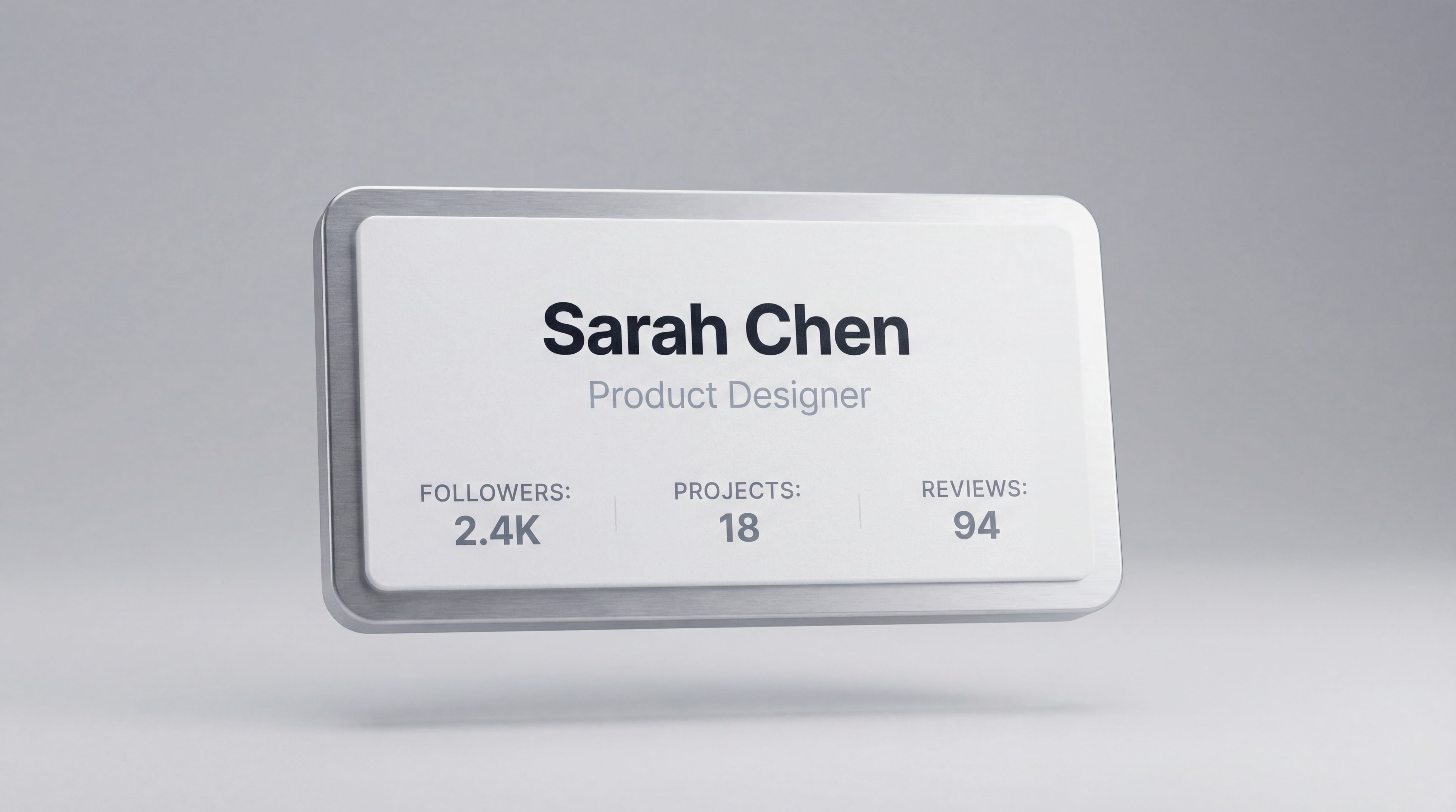 - "A UI card component showing a user profile with the name 'Sarah Chen' in bold, the title 'Product Designer' below in grey, and three stat labels reading Followers: 2.4k, Projects: 18, and Reviews: 94 in small caps"