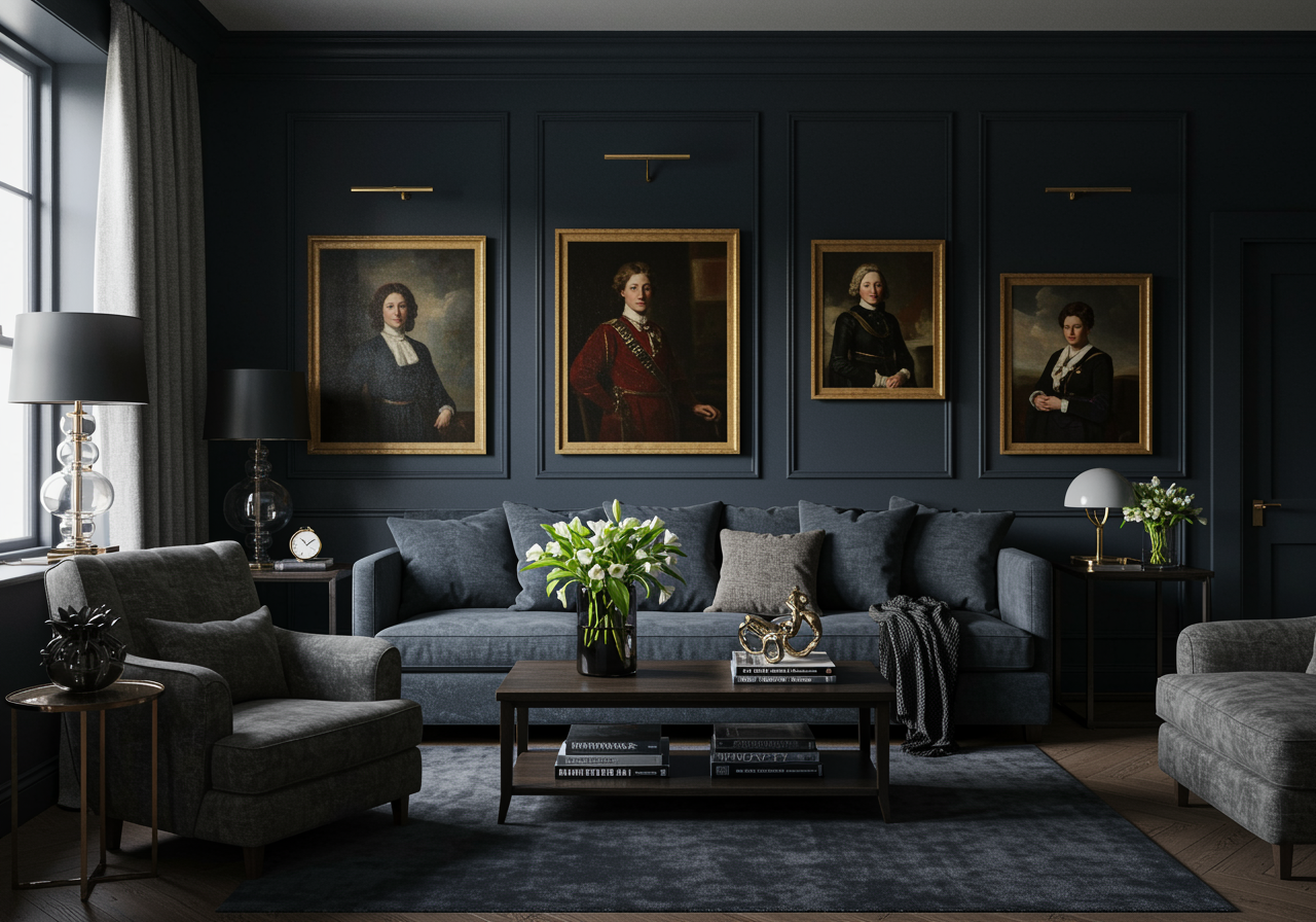 - Brass and gold accents used sparingly