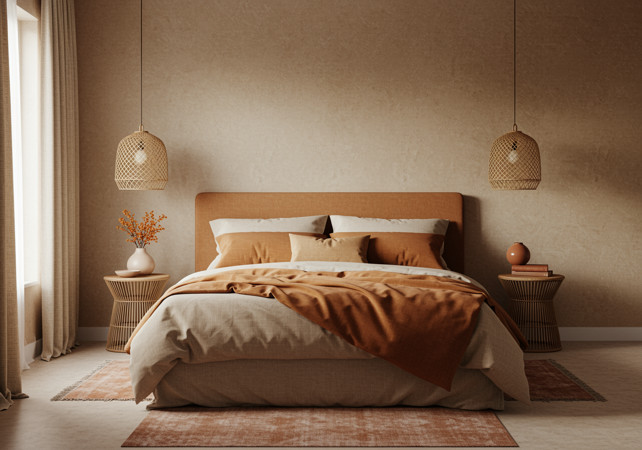 - Warm neutral palettes anchored by natural material tones