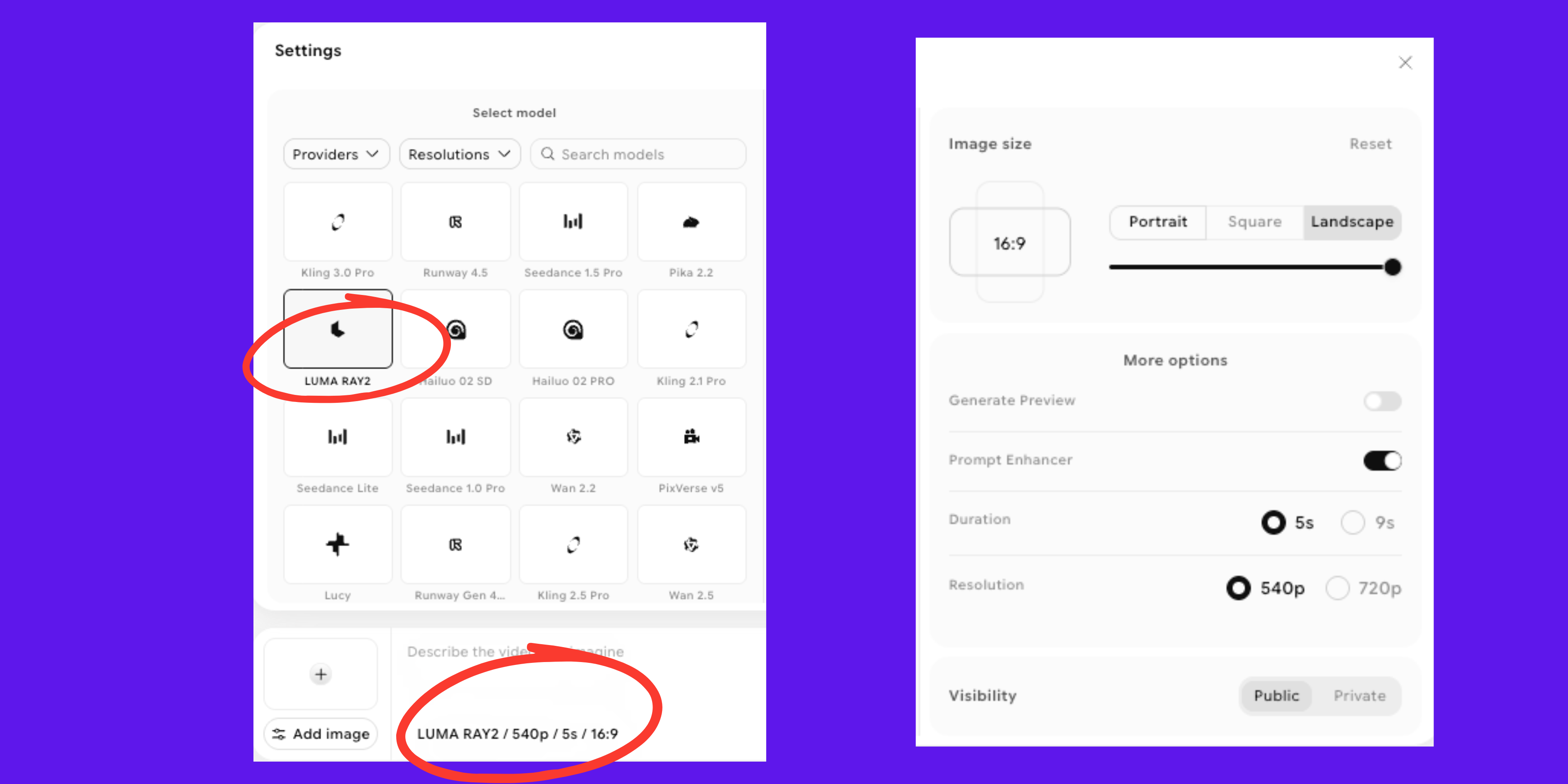 - Choose between Ray2 and Ray2 Flash, depending on whether you want full-quality or faster generation.