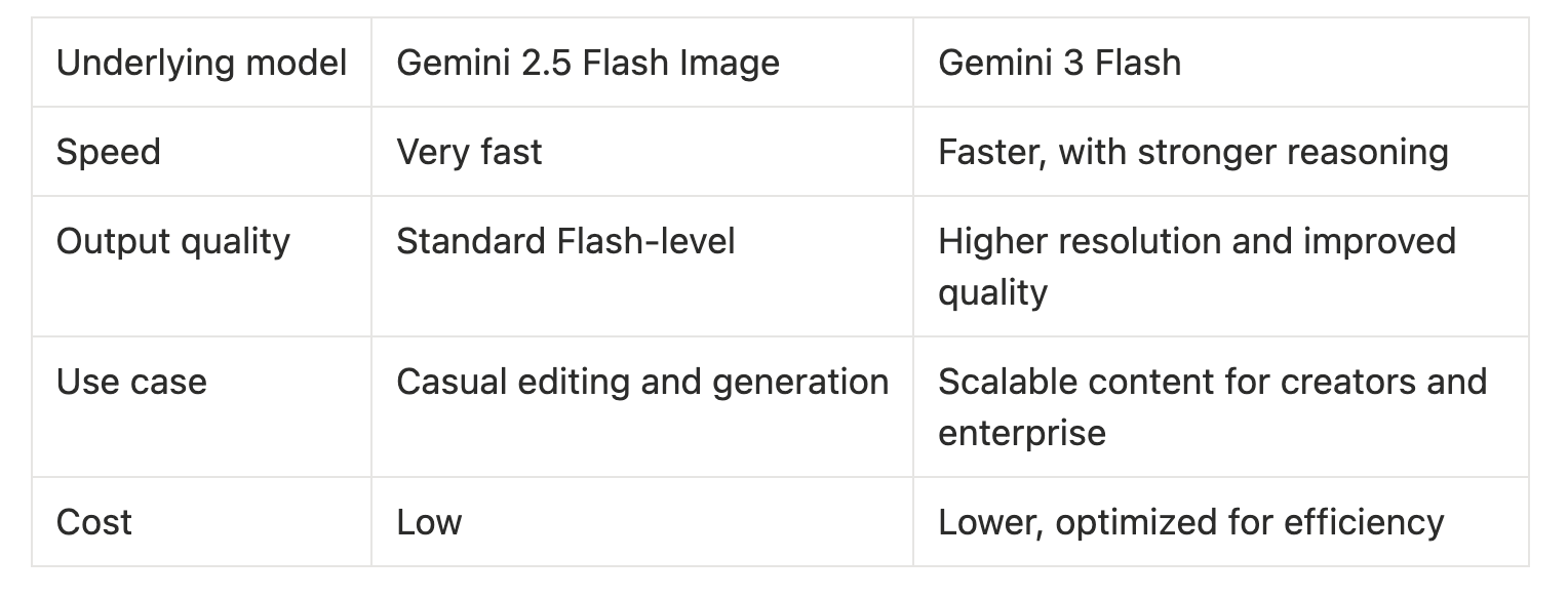 Nano Banana, based on Gemini 2.5 Flash Image, was primarily designed for low-latency, casual creation. It gained popularity for quick edits, simple transformations, and stylized results that performed well on social platforms.