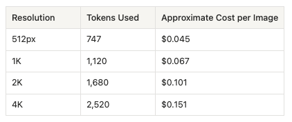- 2K (2048x2048) images consume 1,680 tokens → $0.101 per image