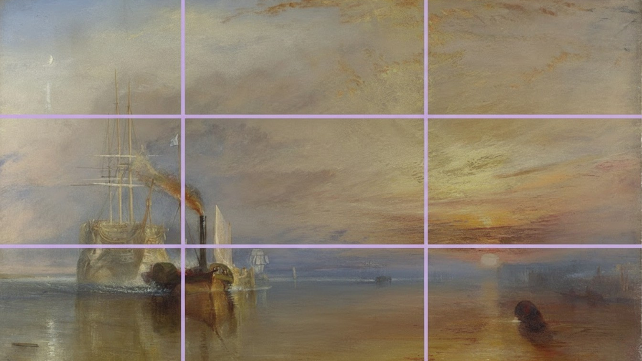 Turner’s The Fighting Temeraire using the rule of thirds, with the ship on the left and the tugboat and sun on the right, balancing emotion and contrast.