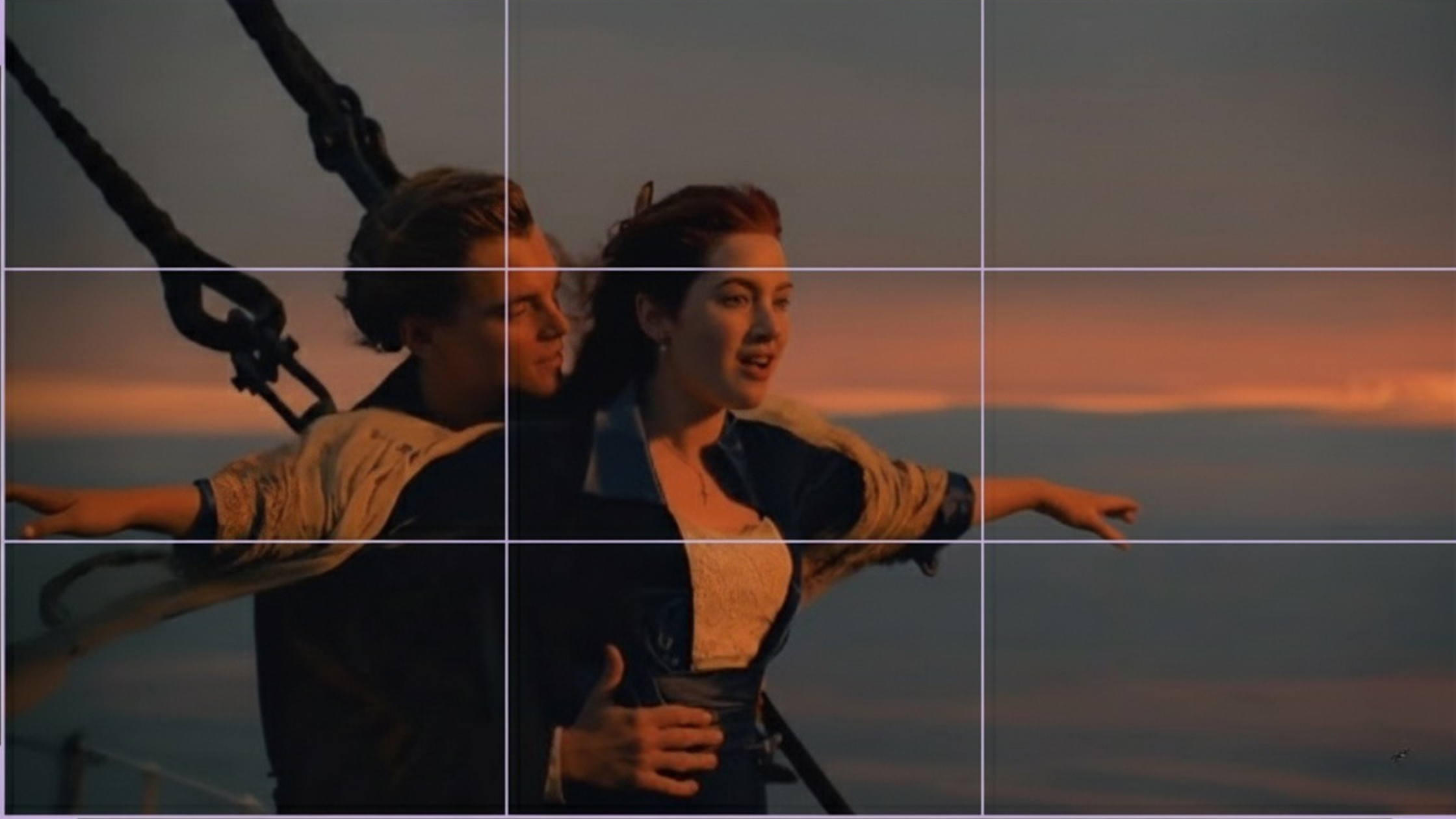 Titanic bow scene illustrating the rule of thirds, with Leonardo DiCaprio’s face at a top-left intersection and Kate Winslet’s arms aligned along the lower grid line.