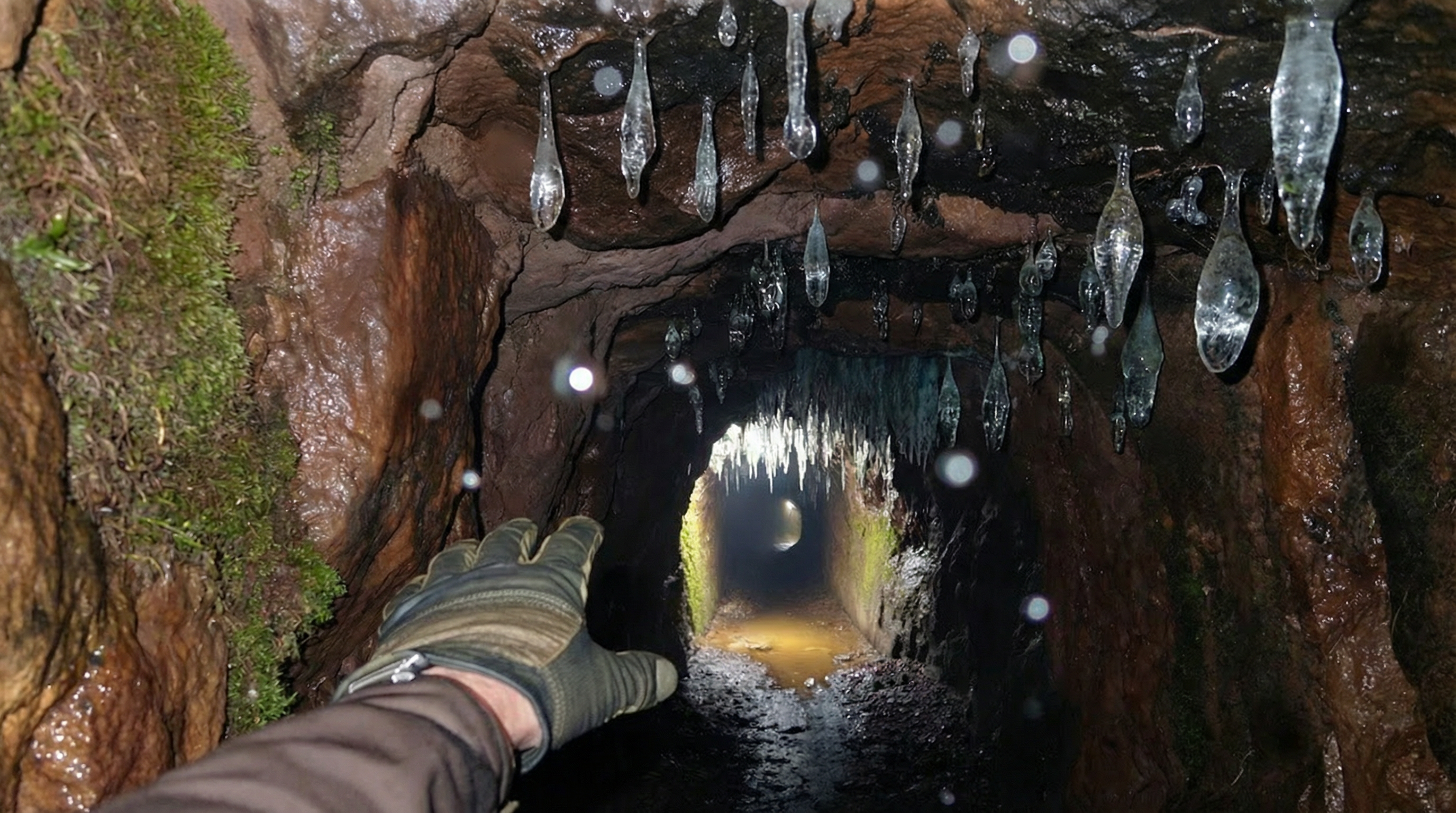 First-person POV handheld footage with slight natural shake. The only light comes from a headlamp, illuminating damp mossy walls. The camera moves through a narrow tunnel; the hand occasionally enters the frame. Audio captures heavy breathing, footsteps on wet soil, and raw on-location sounds. When the tunnel opens, the camera pauses, then pans slowly left to right over glowing semi-transparent crystals. Footsteps hit rocks with sharp clacks that echo through the cavern. The explorer exhales in awe as the sound swirls and fades.