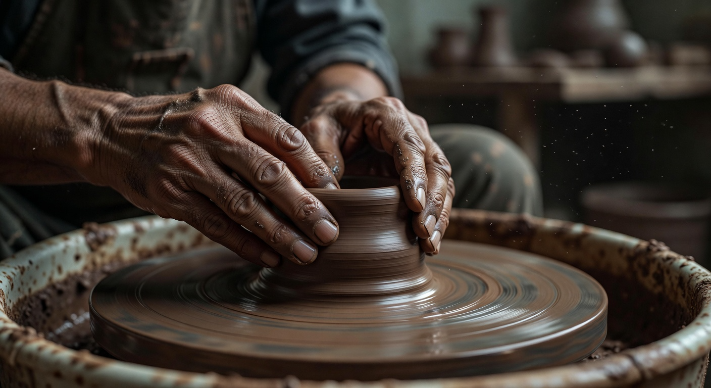 Close-up, intimate documentary-style footage. An elderly craftsman's hands work clay on a potter's wheel. Extreme close-ups alternate: fingers pressing into clay, water spreading across the spinning surface, the form rising and narrowing under steady pressure. The camera never cuts to his face. Only hands. Natural window light from one side. Occasional rack focus between foreground hands and background tools hanging on a workshop wall. Audio: the low hum of the wheel, wet clay sounds, and distant birdsong from an open window. No music. No narration.