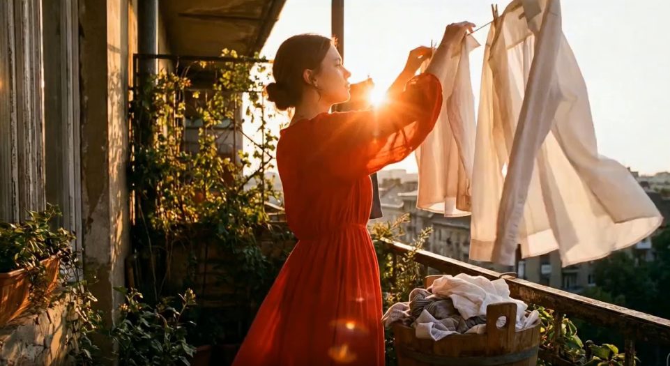 The girl gracefully hangs the clothes out to dry, and after finishing, she takes another piece out of the bucket and shakes it vigorously.