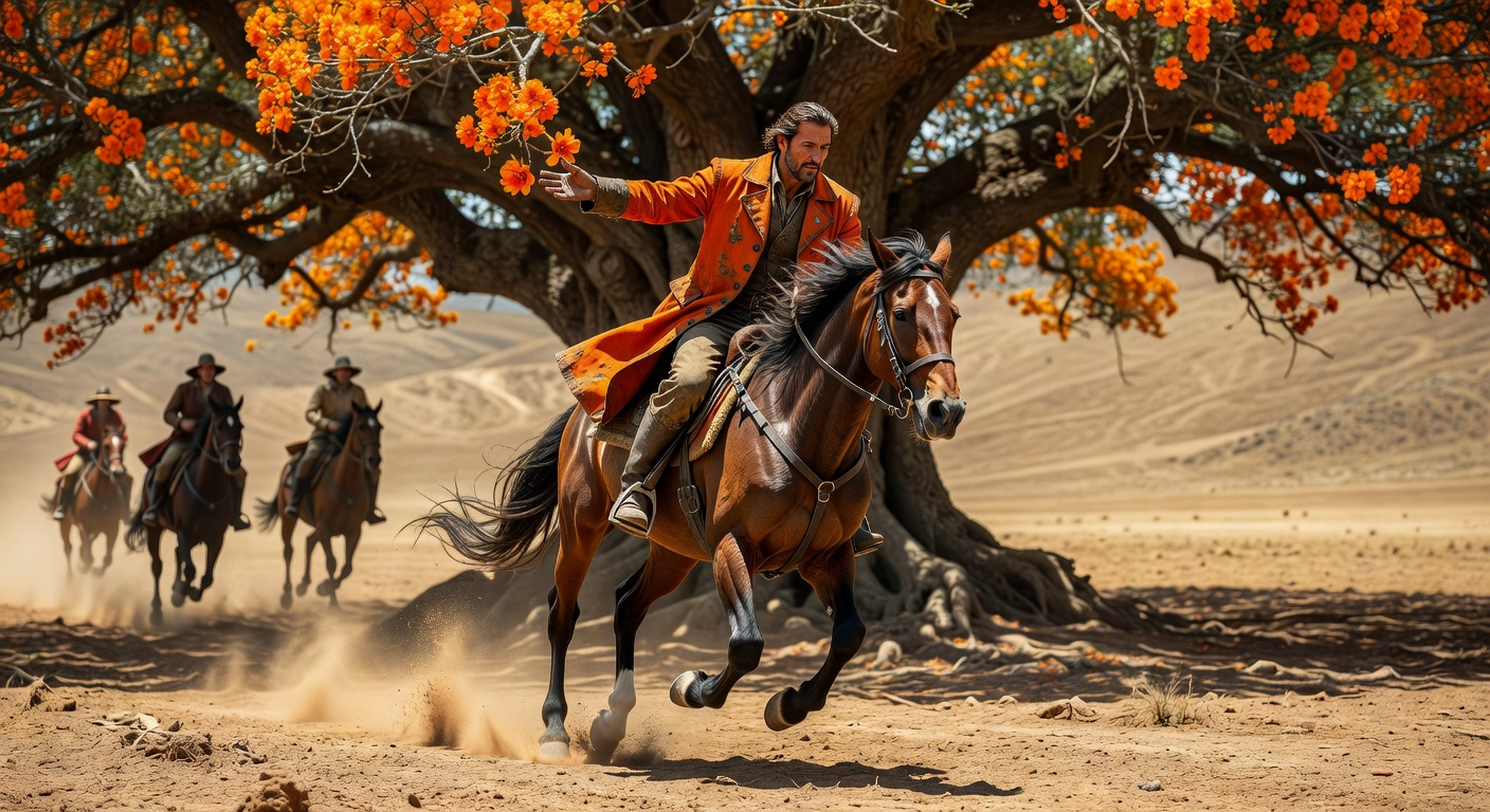 A man in orange rides a brown horse toward a large tree blooming with orange flowers. He plucks two flowers, then other riders follow. The camera pushes in and circles as he dismounts swiftly, then approaches a woman in white on a white horse to present the flowers. Style: classical Chinese βcourt lady paintingβ aesthetic. Music: cheerful traditional Chinese folk instrumental.