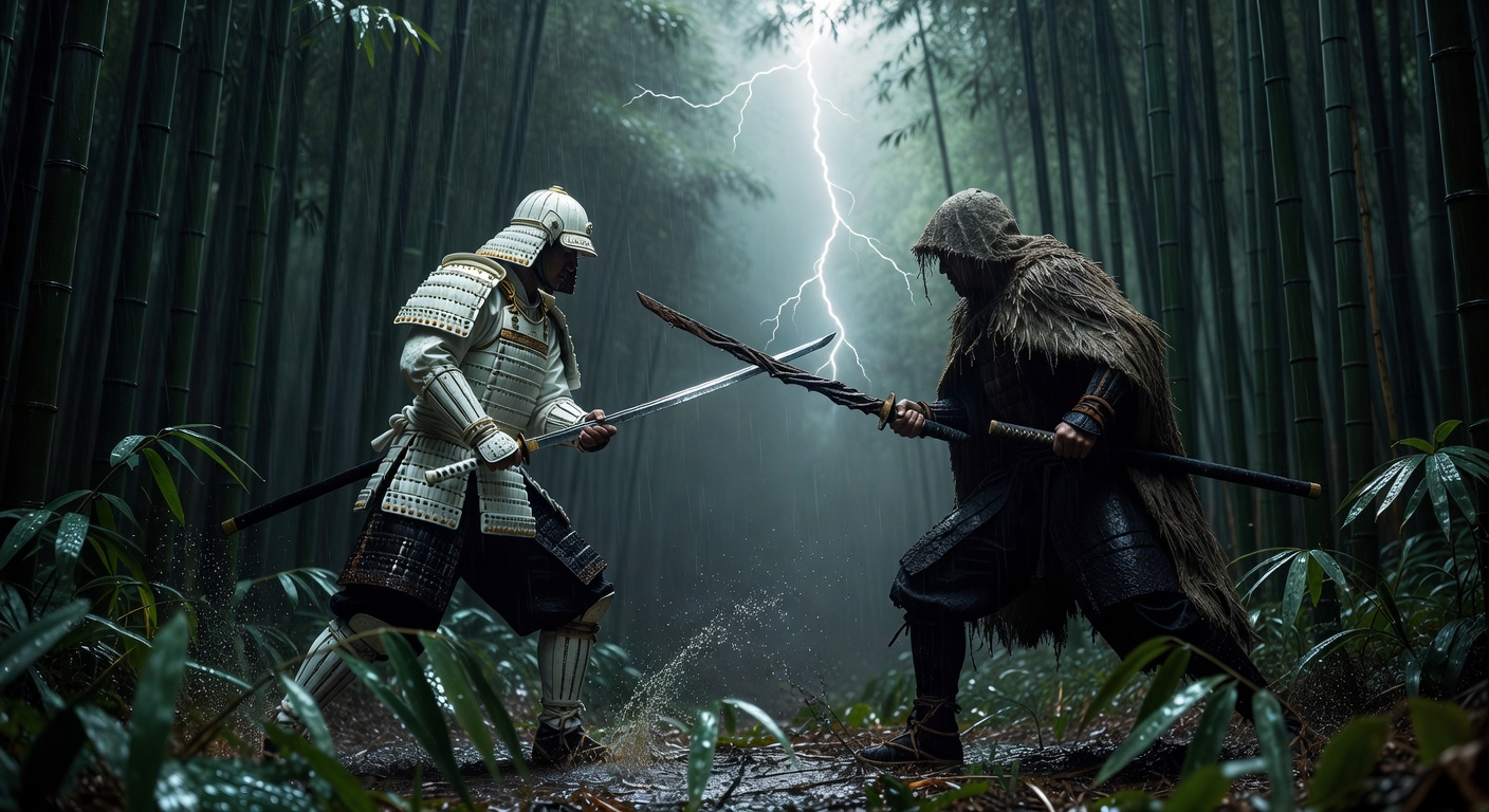 A white-clad swordsman faces a straw-cloaked swordsman in a bamboo forest under heavy rain. The camera slowly pans, shifting focus between raindrops and sword hilts, building tension. Thunder flashes, and they charge simultaneously. Side-view shot captures mud-splattered footsteps, then a slow-motion weapon clash shows circular shockwaves scattering raindrops and bamboo leaves. The scene resumes normal speed with both landing back-to-back as the straw-cloaked swordsmanβs hat splits open, ending abruptly with dramatic impact.