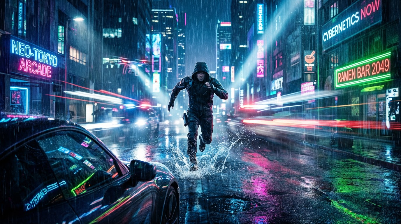 High-energy cinematic chase at night in a neon-lit city. A lone character sprints through rain-soaked streets while police drones and headlights blur past. Quick cuts show close-ups of eyes, boots splashing puddles, and wide traffic shots. The character vaults barriers, slides across car hoods, and dodges explosions. Handheld camera style with motion blur and dynamic lighting. The sequence ends in slow motion as he leaps off a rooftop with city lights streaking beneath him.