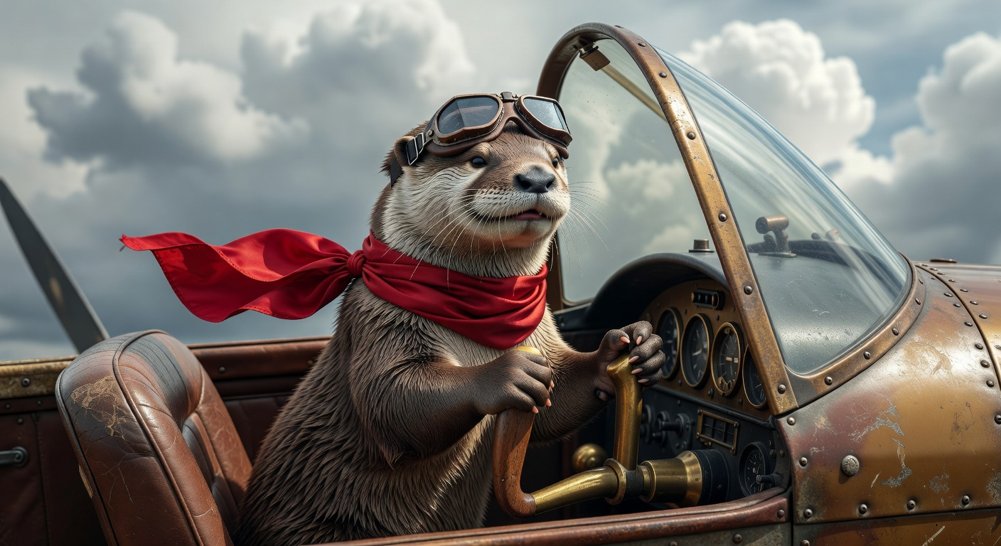 A nature documentary scene showing an otter piloting a small airplane. The otter wears aviator goggles and a tiny scarf, paws on the controls, looking focused yet playful. Camera follows from a dynamic low-angle tracking shot, showing the plane soaring over rivers, forests, and mountains. Include realistic clouds, sunlight glinting on the wings, and gentle propeller motion. Style: vibrant, slightly whimsical, photorealistic with cinematic framing. Light orchestral or adventurous background music.
