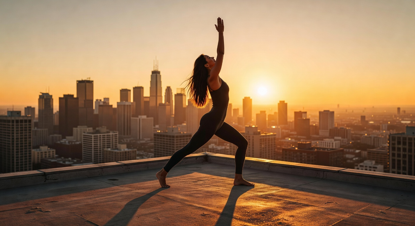 A woman practices yoga alone on a high rooftop at sunrise. City skyline stretches behind her, golden hour light catching her silhouette. Camera begins on a slow crane shot from below the roofline, rising until the full cityscape is revealed behind her. She moves through a sun salutation sequence. Each transition is fluid and deliberate. Shallow depth of field keeps the background a soft bokeh of warm light and steel. No music. Only ambient wind and distant city hum. Medium shots alternate with close-ups of hands pressing into the mat and feet grounding at the edge of the pose.