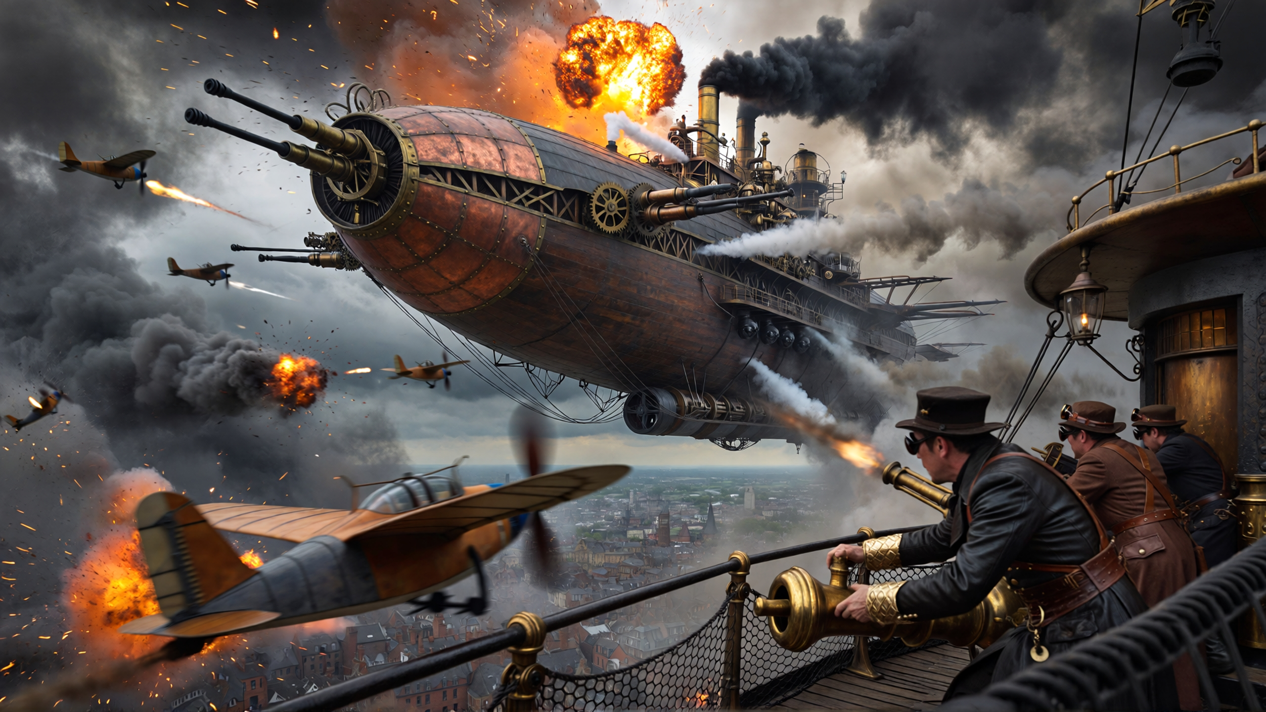 A massive steampunk airship engages in battle above a city. Smoke and steam fill the sky, with smaller airships darting around. Explosions throw sparks into the air. Crew members operate mechanical weaponry, levers, and pulleys with precision. Camera angles shift dynamically to show the scale of the battle, the intricate gears of the ship, and the tension of the fight.