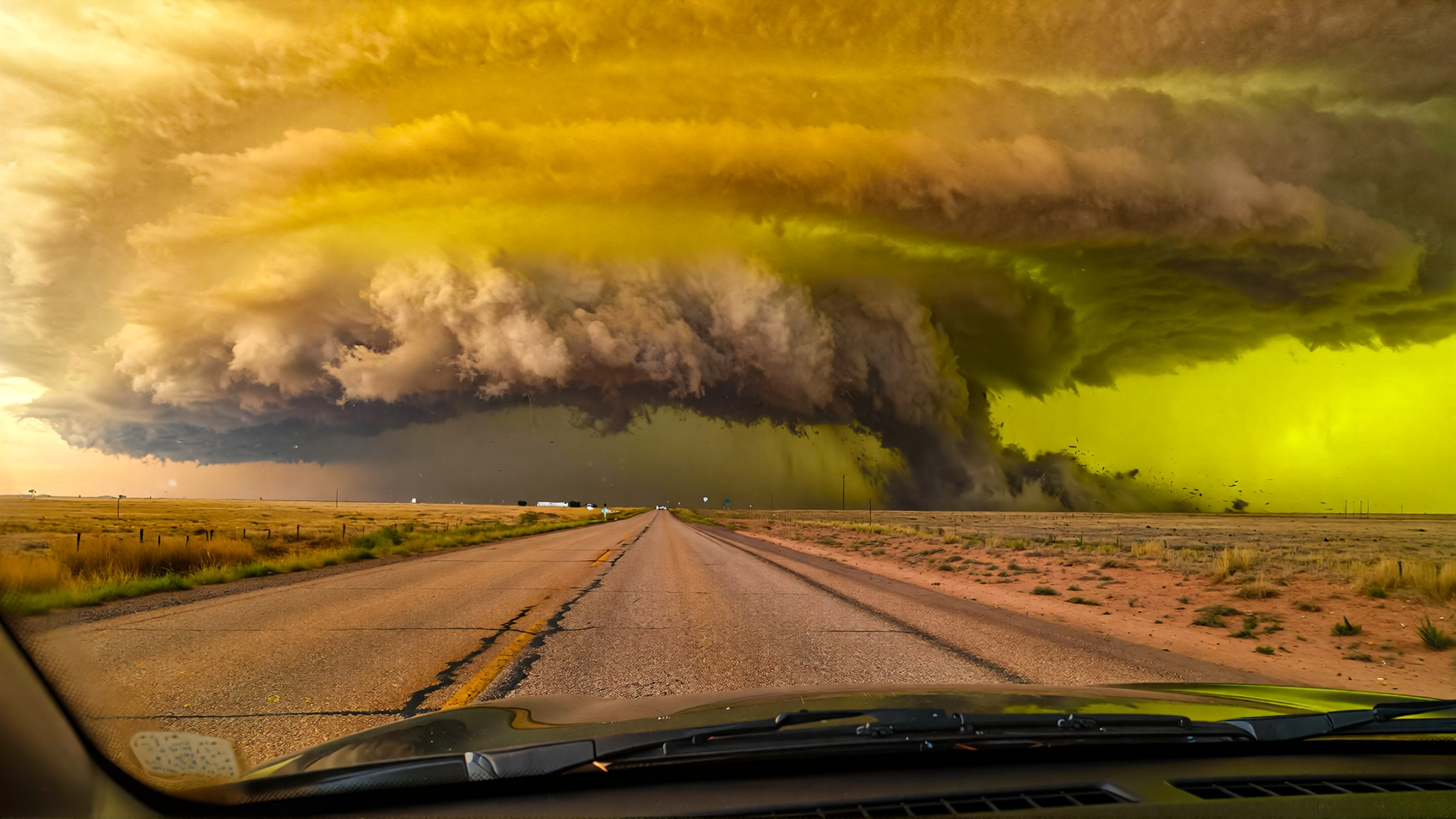 Handheld dashcam-style footage from inside a vehicle driving toward a massive tornado on a flat American plain. The sky is yellow-green. The funnel is fully formed and tracking left to right across the road ahead. Radio chatter is audible over wind noise. The driver's hand enters frame to adjust the camera angle. Rain begins β light at first, then heavy. Wipers struggle. Lightning strikes ahead. Cut to exterior wide shot: the vehicle, small against the vast sky, continues toward the storm. Audio mix: raw wind, static radio, rain intensity building.