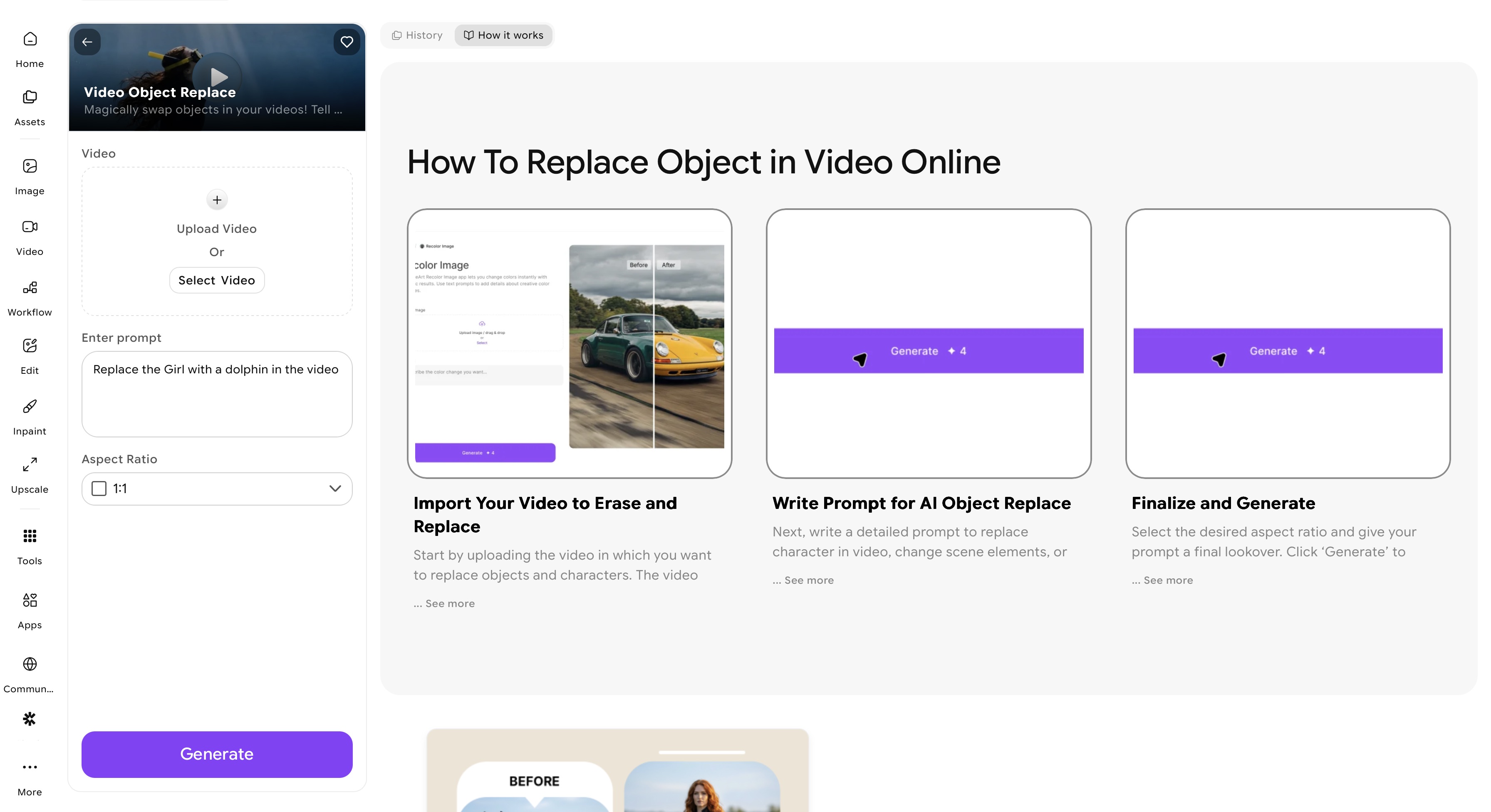 ImagineArt Video Object Replace app dashboard