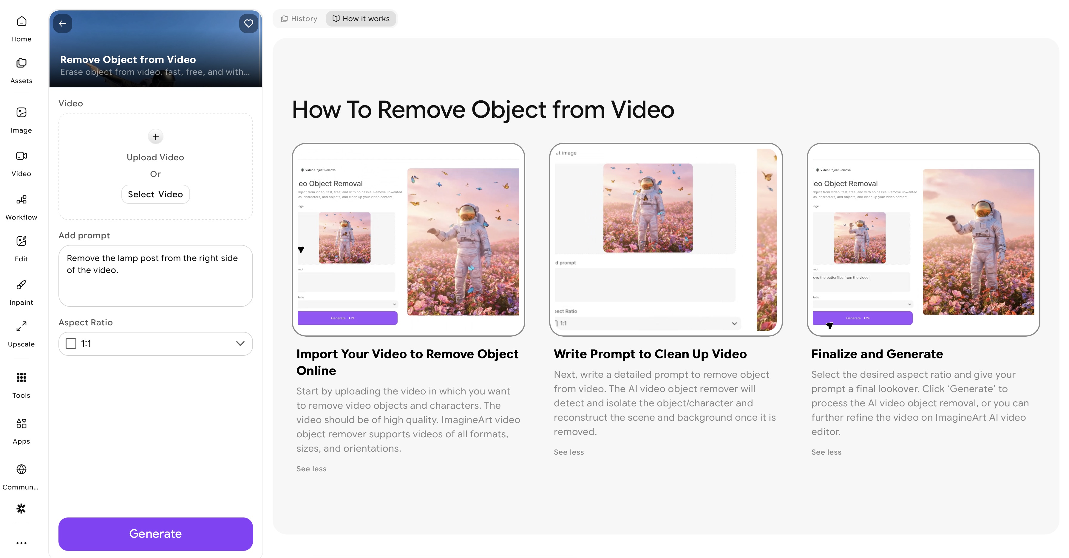 ImagineArt Video Object Removal app dashboard