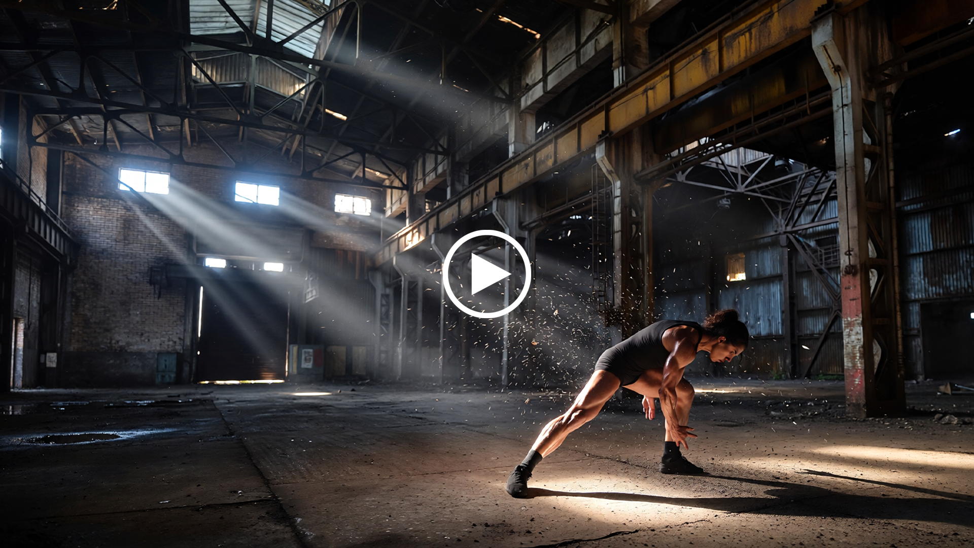 A dancer performs fluid movements in an empty warehouse with dramatic side lighting, creating strong shadows. The camera circles around the dancer continuously as they move through the choreography. Dust particles float visibly in the light beams. The only sounds are the dancer’s footsteps and breathing with atmospheric electronic music underneath. The mood feels intense and artistic.