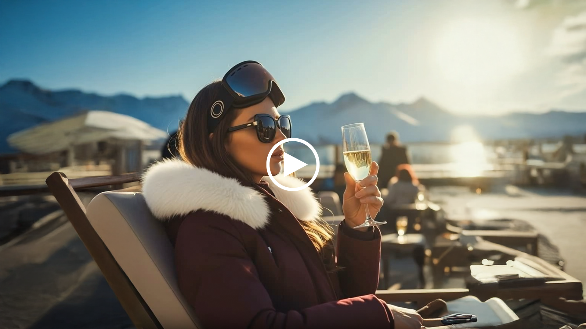 Apres ski model luxury mimosa outside, sun shining on profile, dark sunglasses, a higher elevation model looking away over the mountain, more relaxed.