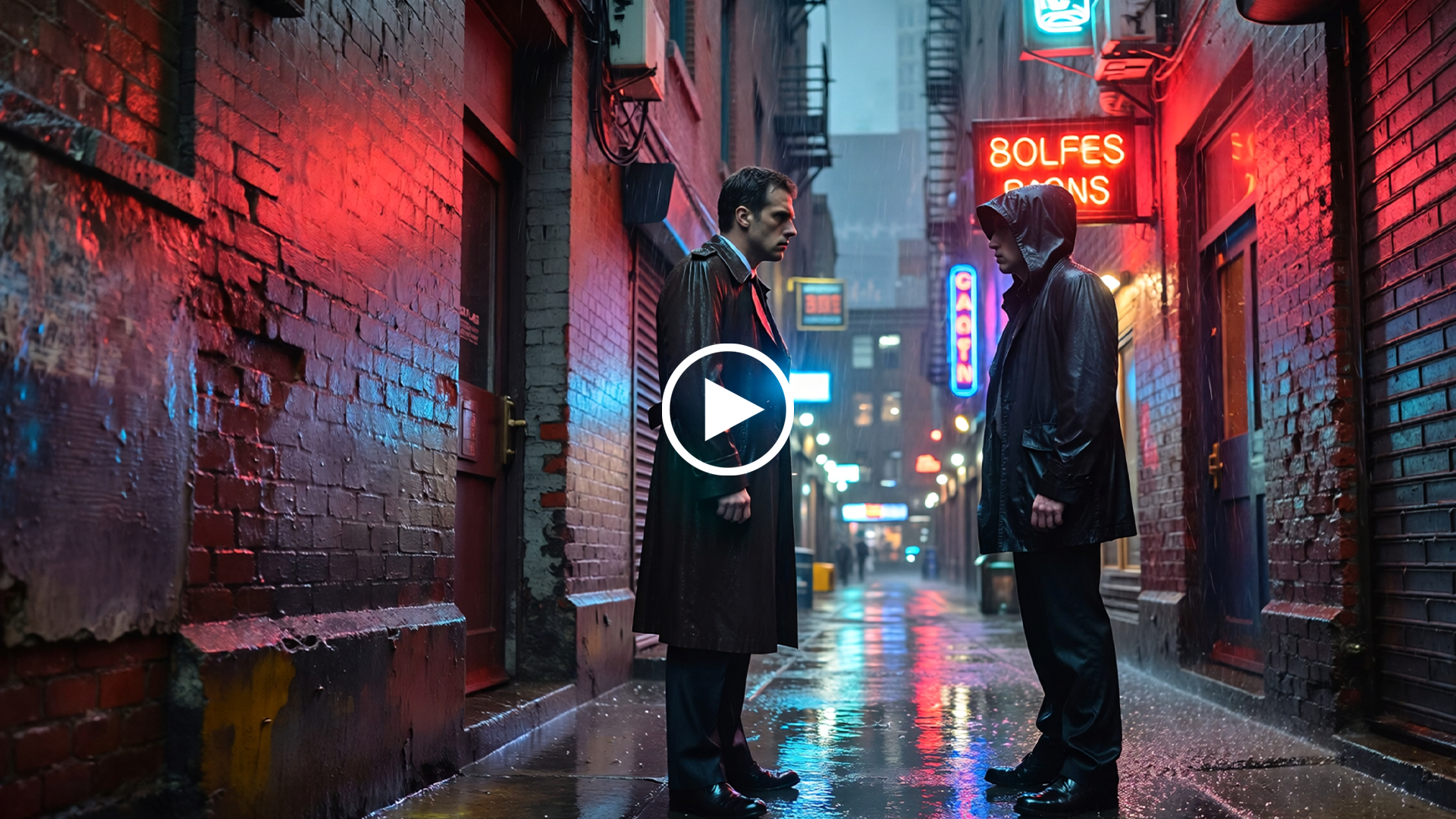 Two people stand facing each other in a narrow city alley while steady rain falls on the wet pavement. Neon signs from nearby shops cast blue and red light across the scene, reflecting off puddles. The camera slowly moves forward between them as tension builds. One person finally speaks: “You should not have come back here.” Thunder rumbles distantly as silence follows the words.