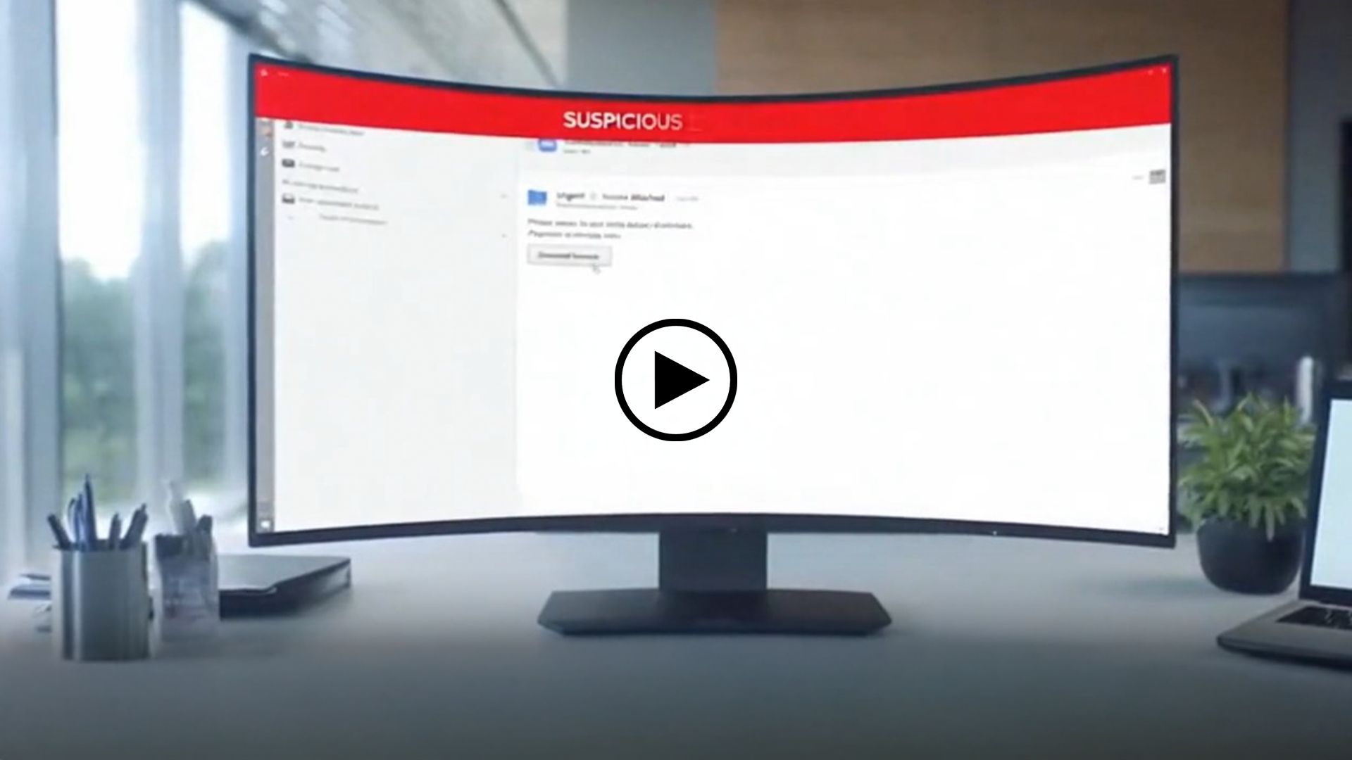 Animated realistic 3D scenario inside a corporate office: a hacker’s email appears on a computer screen, a red alert flashes, a visual of data flowing out of the network to an external server, camera cut to worried employee, then graphic overlay ‘Risk identified’. Calm male voice-over: ‘Here’s how phishing infiltrates your organization in three steps.’ Soft technical background music.