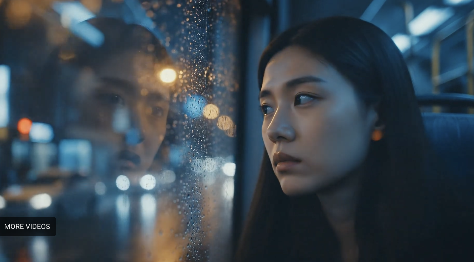 Close-up with very shallow depth of field, a young woman's face, looking out a bus window at the passing city lights with her reflection faintly visible on the glass, inside a bus at night during a rainstorm, melancholic mood with cool blue tones, moody, cinematic.