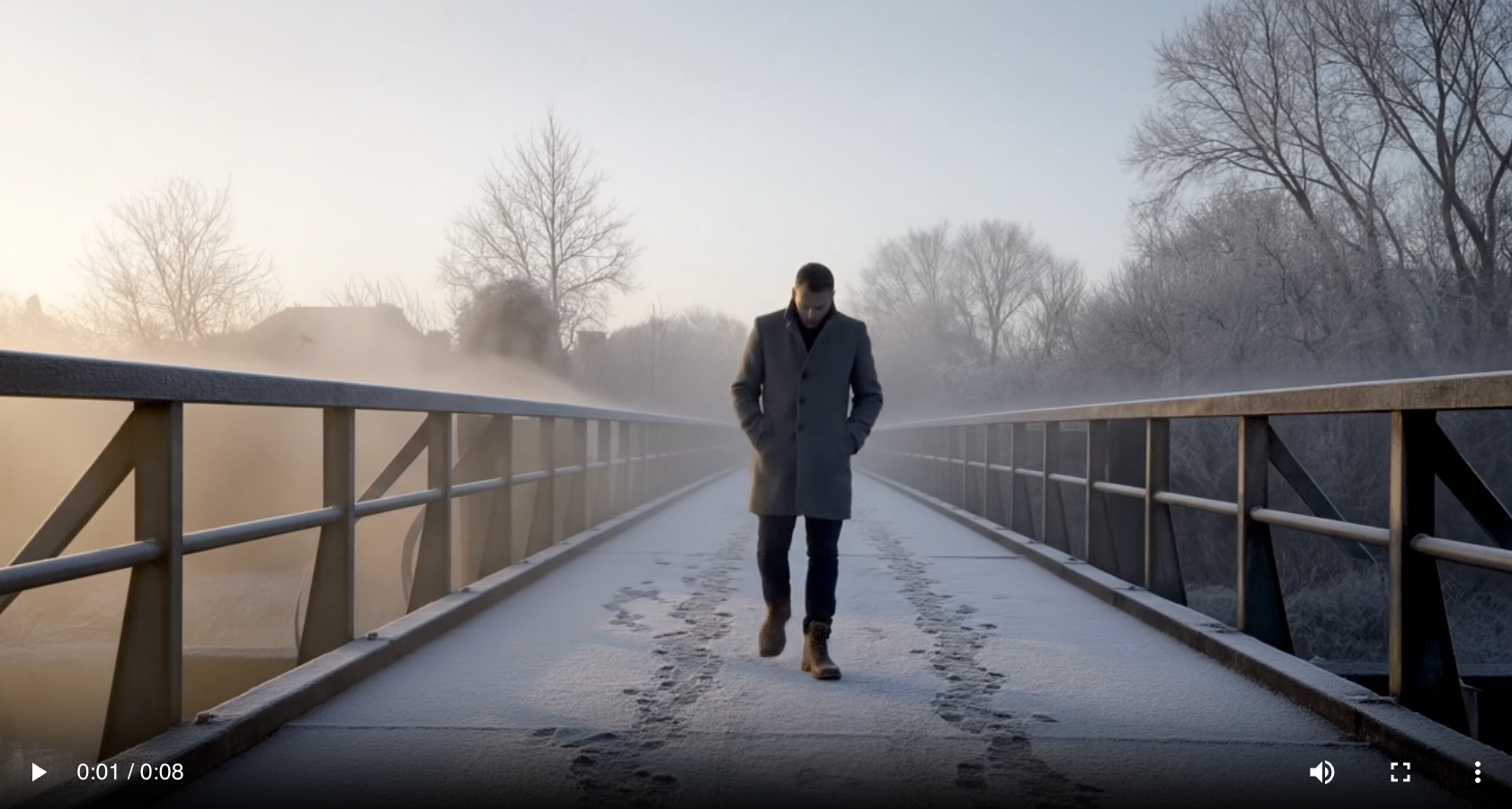 A wide, eye-level cinematic shot captures a man walking slowly across a frost-covered bridge at dawn, his hands tucked into the pockets of a heavy coat. Pale morning light glows faintly through soft, curling fog that clings to the bridge railings. In the distance, bare trees fade into the mist, their skeletal branches barely visible. The pace is unhurried and reflective, evoking a naturalistic and quiet mood.