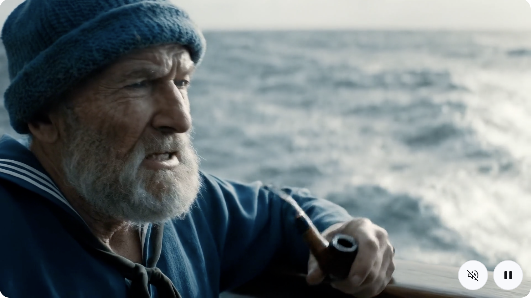 A medium shot frames an old sailor, his knitted blue sailor hat casting a shadow over his eyes, a thick grey beard obscuring his chin. He holds his pipe in one hand, gesturing with it towards the churning, grey sea beyond the ship's railing. "This ocean, it's a force, a wild, untamed might. And she commands your awe, with every breaking light."