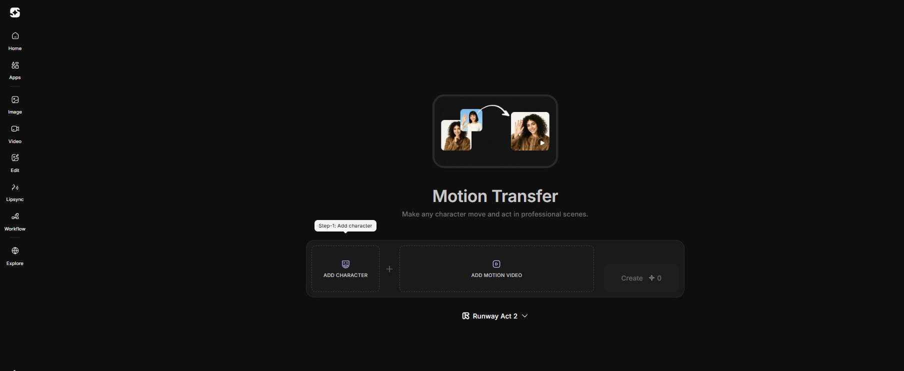 - Motion from video: Copies body movement and facial expressions from a reference video onto an image or subject.