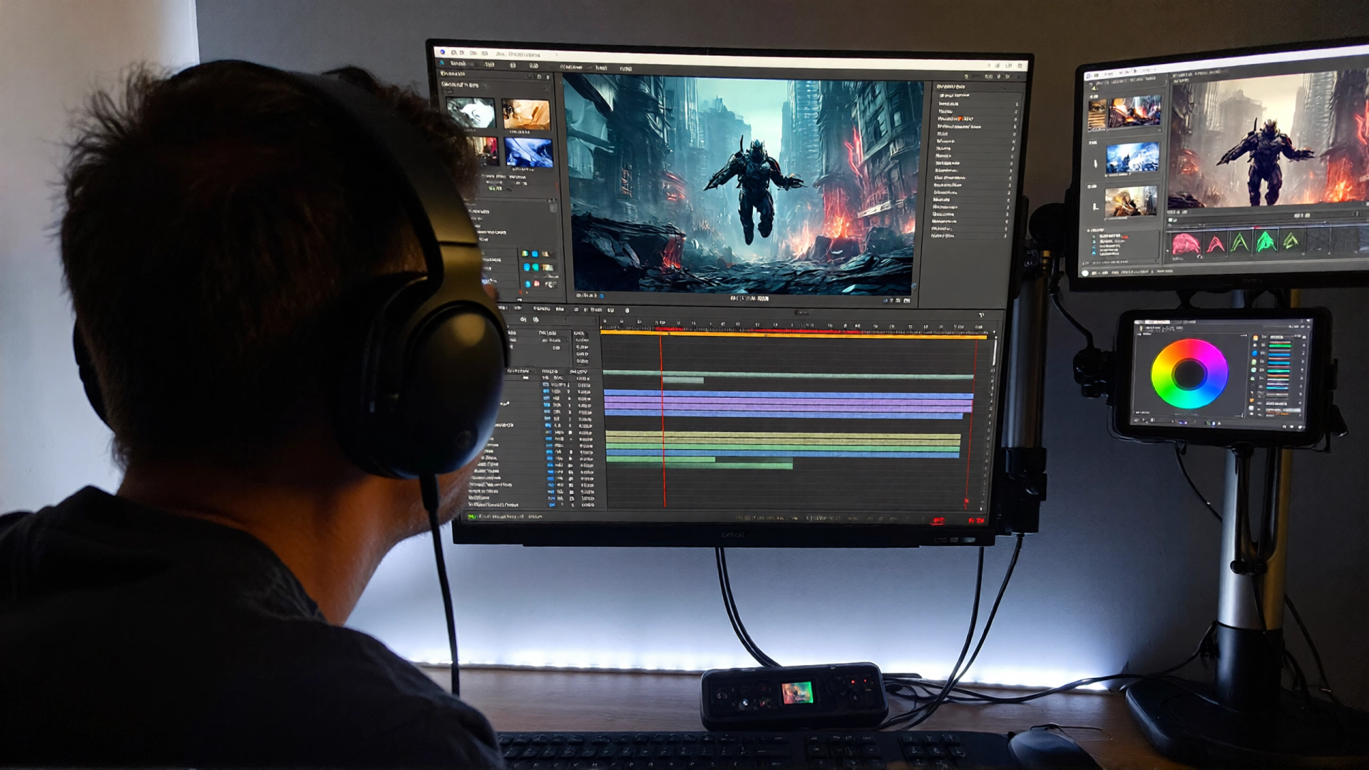 Digital creator editing a high-detail cinematic sequence on multiple screens.