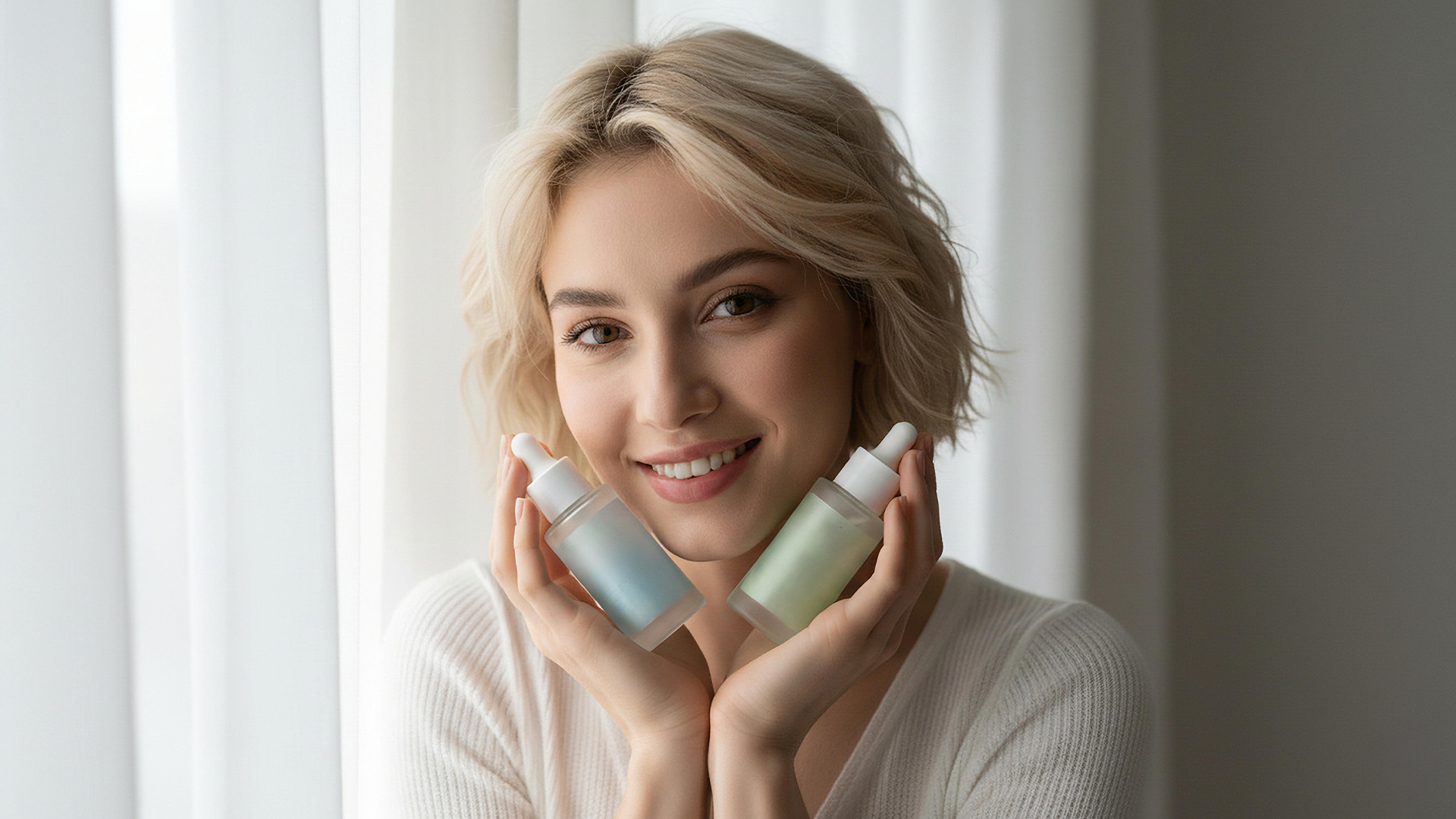 Creator holding two cosmetic serum bottles in a clean, natural-light setup.