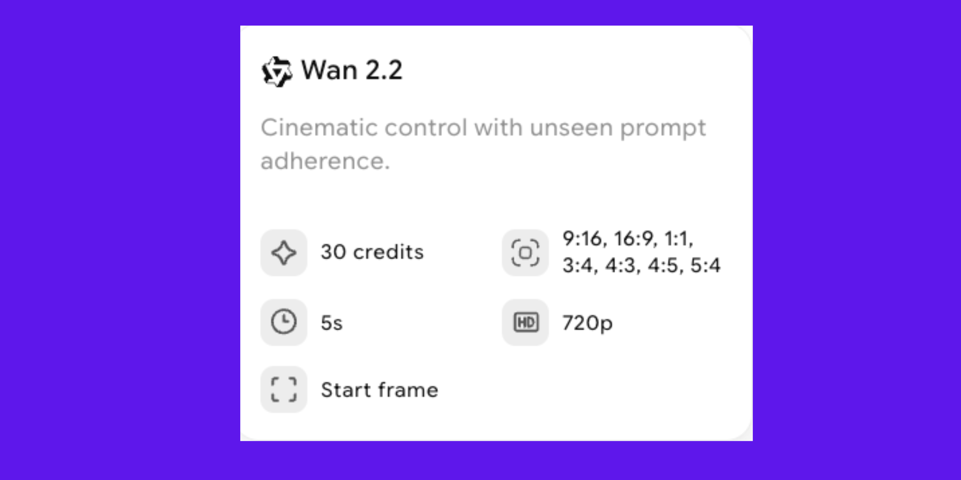 Wan 2.2 costs 30 credits per video. It works best for short clips with basic animation functions and Motion Transfer. Each video lasts up to 5 seconds and exports at 720p. Aspect ratios include 9:16, 16:9, 1:1, 3:4, 4:3, 4:5, and 5:4, suitable for various social media formats.