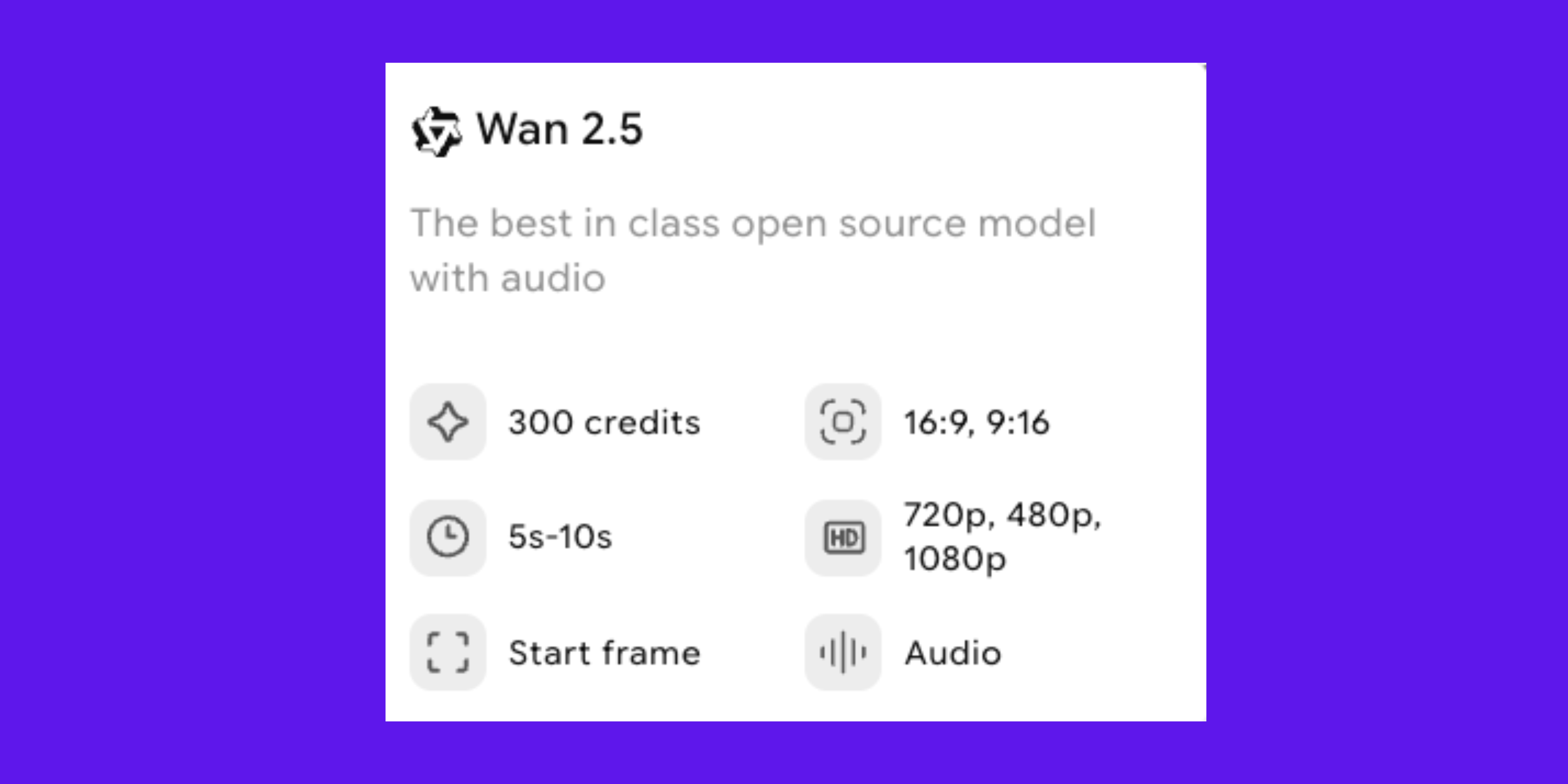 Wan 2.5 costs 300 credits per video. It supports native audio and start frame control. Videos run 5–10 seconds in 480p, 720p, or 1080p resolution. Aspect ratios include 16:9 and 9:16, making it suitable for professional-quality projects.