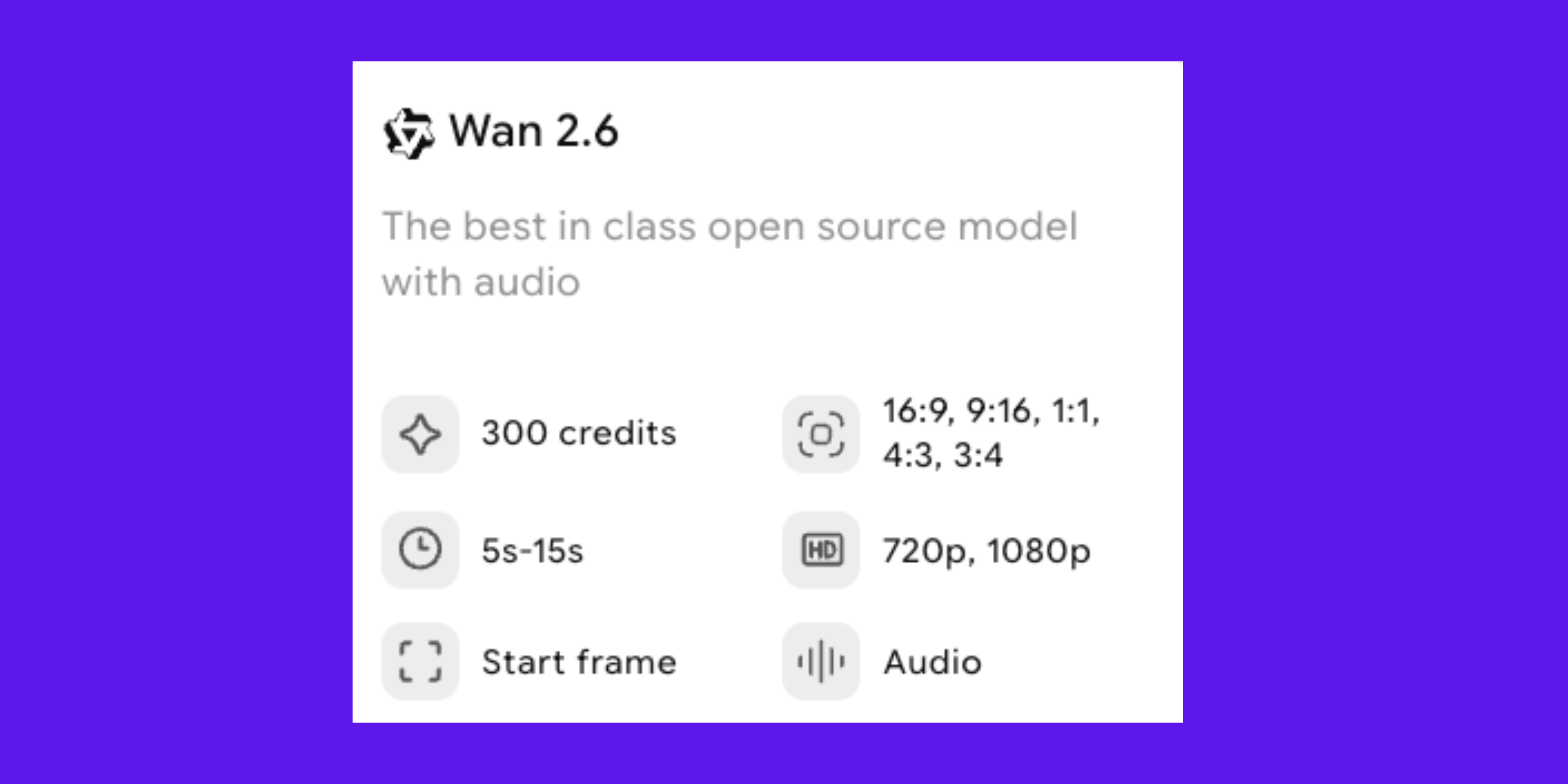 Wan 2.6 also costs 300 credits per video. It provides enhanced audio, flexible durations of 5–15 seconds, and 720p or 1080p resolution. Aspect ratios include 16:9, 9:16, 1:1, 4:3, and 3:4. This model delivers professional-grade video quality for advanced projects.