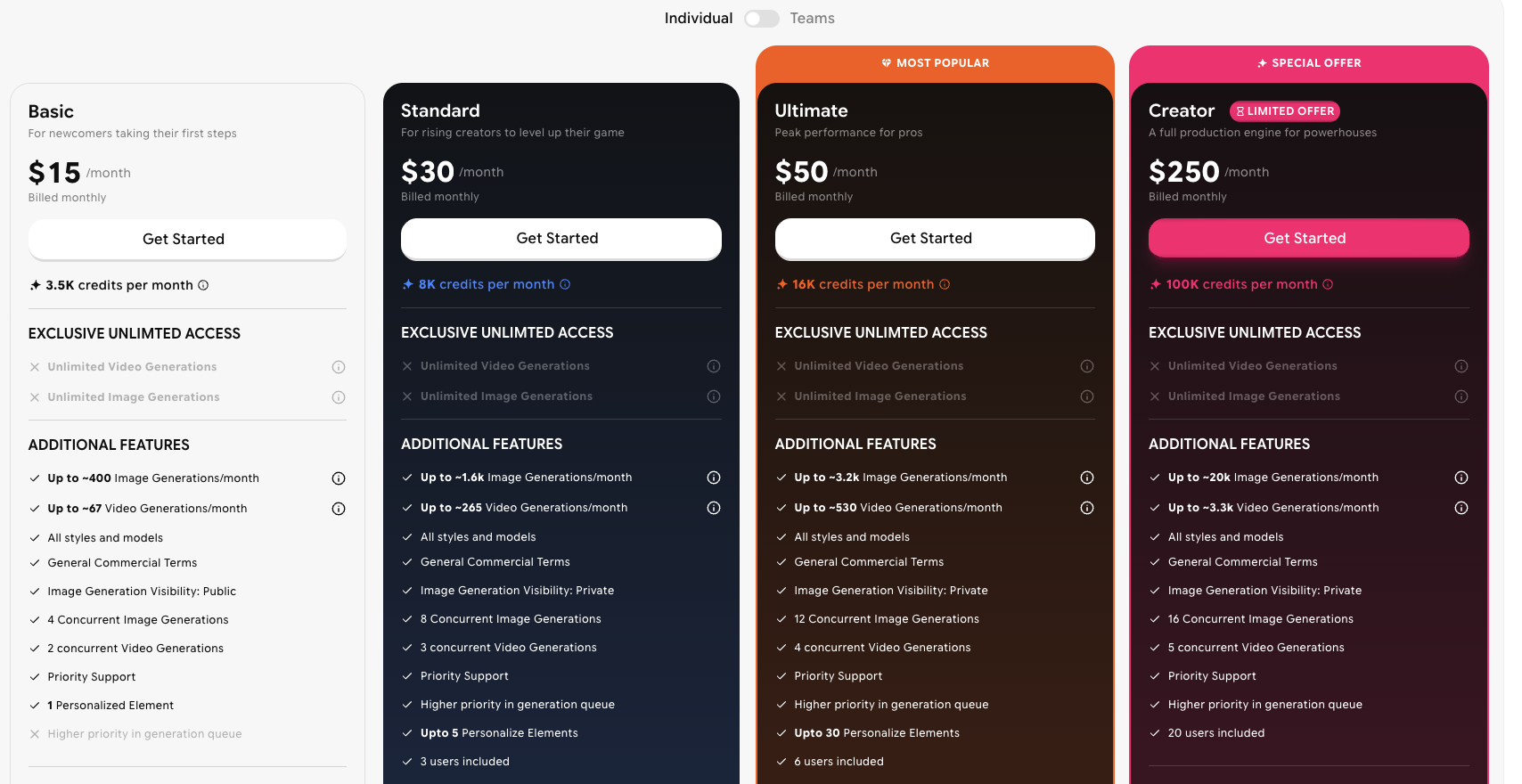 Official Wan AI platform focuses solely on video generation but offers competitive credit packages with Flash Sale bonuses, membership plans from US$5/month, and up to 240 videos per month on the Premium plan.