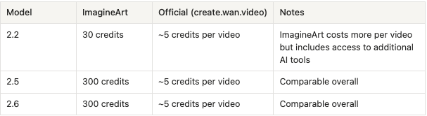 - Credits consumed per video on ImagineArt: Wan 2.2 = 30 credits, Wan 2.5 = 300 credits, Wan 2.6 = 300 credits