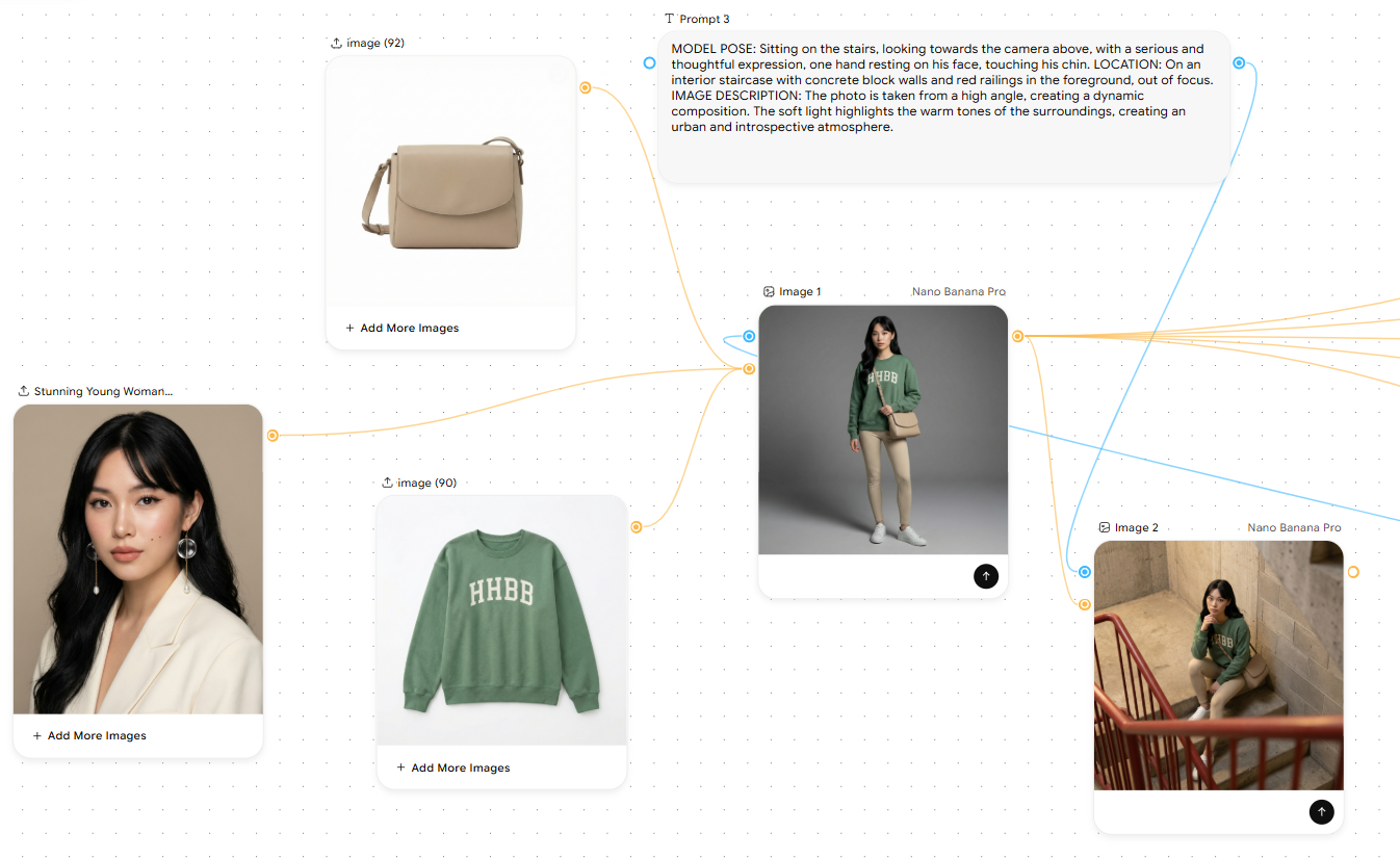 For high-volume e-commerce, the Image Iterator node processes an entire product catalog through the same workflow, applying consistent photography standards at scale. What would take a week of studio time runs overnight. The creative team reviews and approves outputs rather than operating equipment.